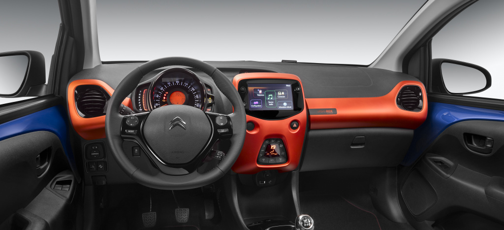Stejná šedá a oranžová se objevuje i na ozdobných prvcích v kabině vozu. Paket Pack Color „Urban Ride“ vytváří originální prostředí, které ještě posiluje soulad mezi zpracováním barev a materiálů v interiéru a exteriéru. Citroën C1 Urban Ride nabízí specifický styl kabiny zahrnující modré látkové čalounění Square a oranžové prvky na panelu multimediálního systému a liště na palubní desce. Manžeta řadicí páky a kryty výstupů vzduchu jsou leskle černé. Na palubní desce byla použita specifická lepicí fólie a tato speciální edice nabízí rovněž koberečky se štítkem „Urban Ride“.