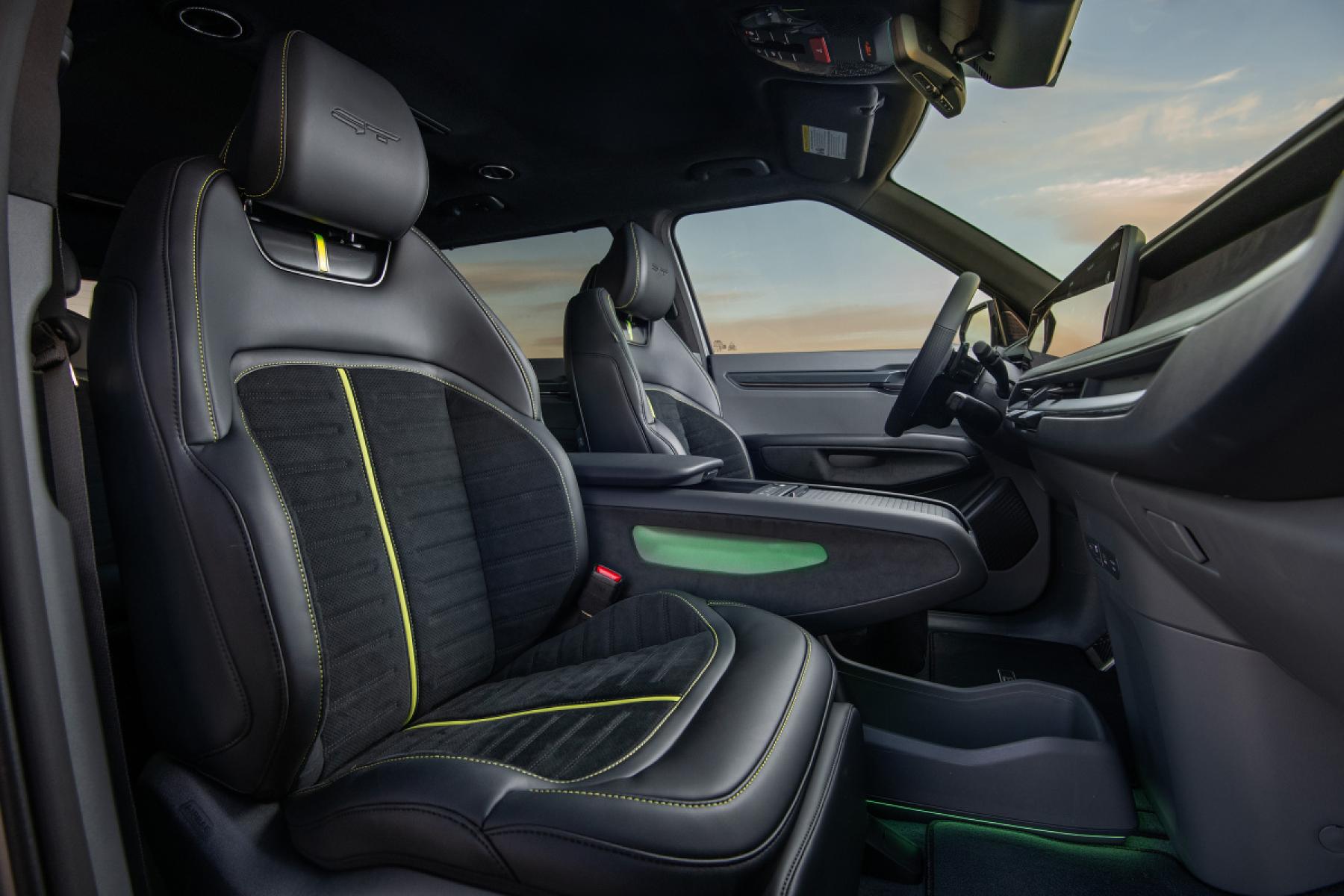 Architektura elektromobilu založená na platformě E-GMP a rozvor 3,10 metru umožňují interiér s výjimečnými rozměry, rovnou podlahou a vysokým komfortem ve všech třech řadách sedadel. Sportovní pedály, anatomicky tvarovaná přední sportovní sedadla, sportovní GT volant – 3 ramenný a neonové akcenty specifické pro GT přispívají ke sportovní atmosféře. Najdete je na speciálně navrženém volantu i na černých sportovních sedadlech s potahy z Alcantary® a kůže, která jsou standardně vybavena jako relaxační sedadla včetně opěrek nohou („prémiová relaxační sedadla“) a lze je při parkování nebo dobíjení polohovat do pohodlné polohy pro ležení. Stejně jako sedadla je i volant elektricky nastavitelný a paměťová funkce ukládá nastavení sedadla řidiče, volantu a vnějších zpětných zrcátek. Sedadlo řidiče nabízí také masážní funkci. Volitelný šestimístný vůz má také relaxační sedadla ve druhé řadě. Díky velkorysému prostoru si cestující na zadních sedadlech mohou užívat polohu v ležení, i když jsou v této poloze i přední sedadla. Výsuvná police integrovaná do středové konzoly slouží jako malý stolek mezi druhou řadou sedadel v šestimístném voze. Vysoká úroveň komfortu, která je součástí standardní výbavy, zahrnuje vyhřívání a odvětrávání sedadel v prvních dvou řadách (sedmimístná verze: krajní sedadla ve druhé řadě), dvouzónovou automatickou klimatizaci a samostatnou automatickou klimatizaci s ovládacími prvky ve stropě pro druhou a třetí řadu sedadel, a také nabíjecí zásuvky USB-C ve všech třech řadách. Opěradla třetí řady lze elektricky sklápět a zvedat. To znamená, že objem zavazadlového prostoru lze v případě potřeby snadno zvětšit z 333 litrů na 807 litrů (šestimístná verze: 828 litrů). Pokud se aktivuje dálkové uvolnění druhé řady sedadel, objem se zvětší na 2.318 litrů (šestimístná verze 2 393 litrů). Pod kapotou se nachází také zavazadlový prostor o objemu 52 litrů.