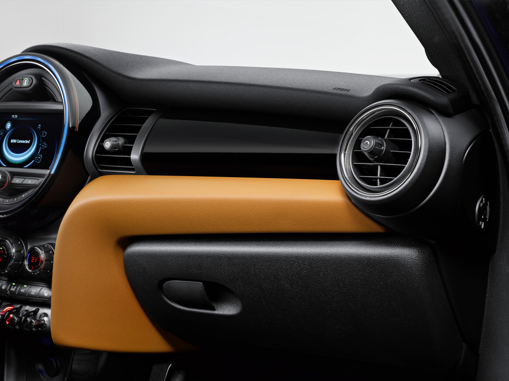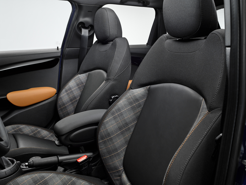 V novém MINI Seven se propojují vybrané materiály a barevné kombinace použité na čalounění sedadel a na dalších částech interiéru. Standardní výbavou jsou sportovní sedadla čalouněná kombinací látky v barvě Diamond Malt Brown a černé kůže. Na výběr jsou i další barevná provedení. Designová edice MINI Seven se vyznačuje logem 7 umístěným na centrálním ukazateli. K dispozici je také speciální barevné provedení Colour Line v barvě Malt Brown, které může nahradit standardní černou verzi.