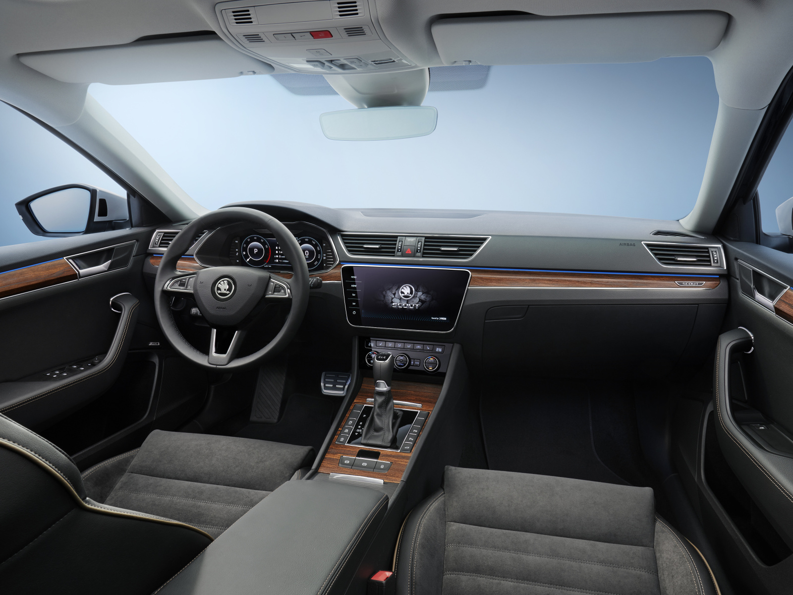 V interiéru cestující potěší vůz ŠKODA SUPERB SCOUT lištami se speciálním dřevěným dekorem s logem SCOUT. Logo SCOUT se nachází i na předních sedadlech. Potahy sedadel mají pro verzi SCOUT specifický vzor s kontrastním prošíváním. Součástí standardní výbavy je čalounění sedadel v kombinaci materiálu Alcantara® a kůže s hnědým kontrastním prošitím a poprvé také s paspulí v kontrastní barvě v přední části předních sedadel. Součástí standardní výbavy jsou vyhřívaná přední sedadla, vyhřívání zadních sedadel je nabízeno na přání. Displej infotainment systému zobrazuje dodatečné údaje o jízdě v terénu. Po nastoupení do vozu přivítá řidiče speciální logo na obrazovce infotainmentu.