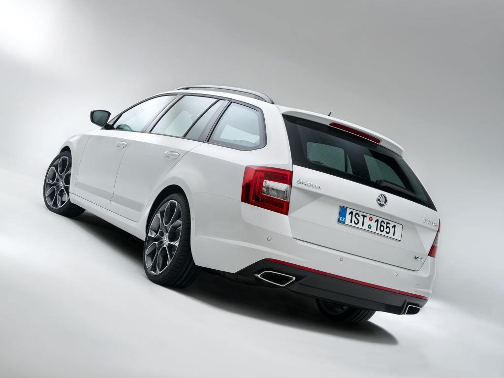 Zádi ve spodní části dominuje černý difuzor a nad ním umístěný široký pás odrazky. Tyto prvky jsou nezaměnitelným identifikačním znakem nové generace vozu Octavia RS, stejně jako obě široké, lichoběžníkové chromované koncovky výfuku. Vedle toho jsou na zádi i zadní svítilny v typickém tvaru písmene C, které jsou nyní sériově vybaveny technologií LED. Nechybí ani spojler: u vozu Octavia RS na pátých dveřích, v provedení kombi je řešen jako spojler na konci střechy.