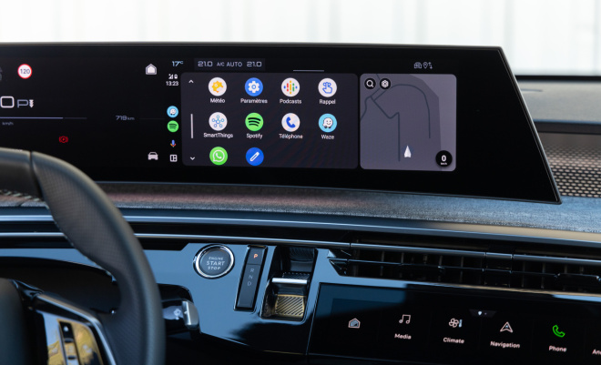 Na pravé straně panoramatické obrazovky uprostřed přístrojové desky se nachází dotyková část, která je přístupná řidiči i spolujezdci. Lze ji používat k ovládání topení, klimatizace, navigace, multimediálních systémů, konektivity atd.