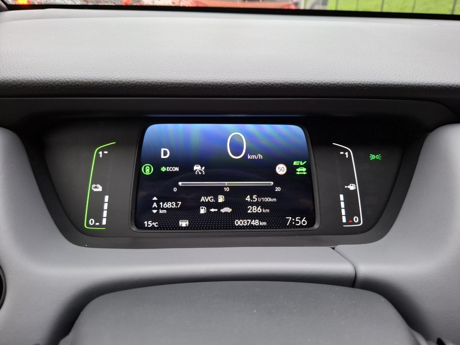 Tady vidíte spotřebu po 1.683 najetých kilometrech. Levý sloupeček ukazuje naplnění baterie, pravý je pak palivoměr benzínu.