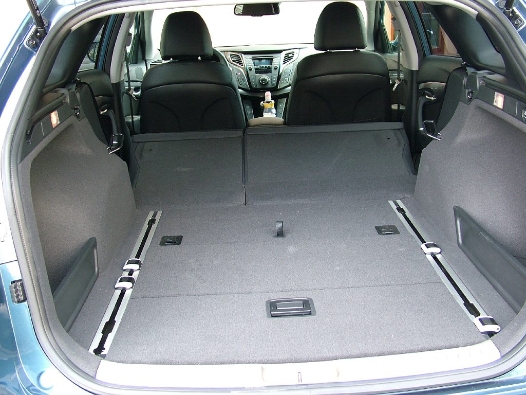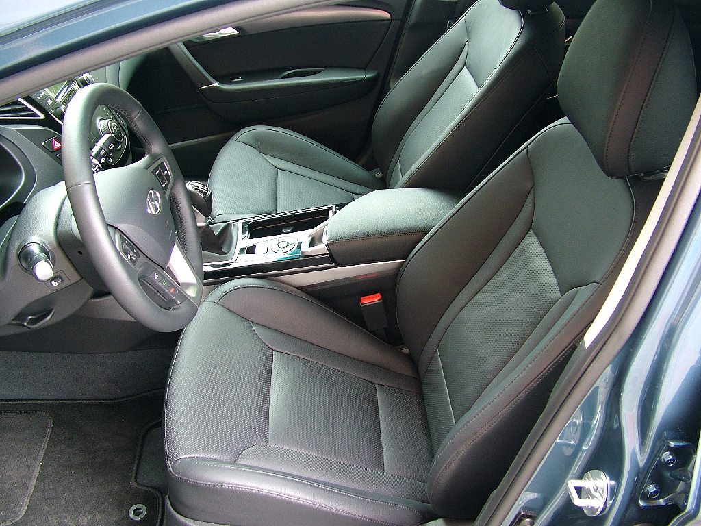 Hyundai vypustil do světa z modelové řady i40 nejprve kombi a díky jeho elegantnímu a sportovně střiženému designu je zřejmé, že korejská automobilka udělala správný krok. Na příkladu i40 CW je vidět, že dynamicky působící vnější tvar kombíku nemusí být na škodu velikosti jeho zavazadlového prostoru. Ačkoli je Hyundai i40 CW o sedm centimetrů kratší i užší než etalon třídy Ford Mondeo Combi, jeho základní zavazadlový prostor skýtá více místa i když jen o zanedbatelné čtyři litry (553 l). Při plném využití prostoru pro zavazadla ztrácí i40 CW na Fordův kombík pouze minimálně (1719 vs. 1740 l). Tahle čísla jsou překvapivá, protože při seznámení s Hyundaiem i40 CW mě jako první napadlo: krásný, ale asi v něm bude málo místa. Jenže tahle pohledná karoserie klame tělem. Rozvor Hyundaie opět zaostává za Mondeem (o 8 cm), ale v kabině si nemůže na nedostatek prostoru stěžovat nejen přední dvojice, ale také trojice cestujících vzadu. Místa je pro všechny dost! Navíc se sedí na pohodlných velkých sedadlech. V testované výbavě Premium čalouněných jemnou kůží. Ta je v místech pod hýžděmi, stehny i zády příjemně perforovaná, což pasažéři ocení zejména v létě.