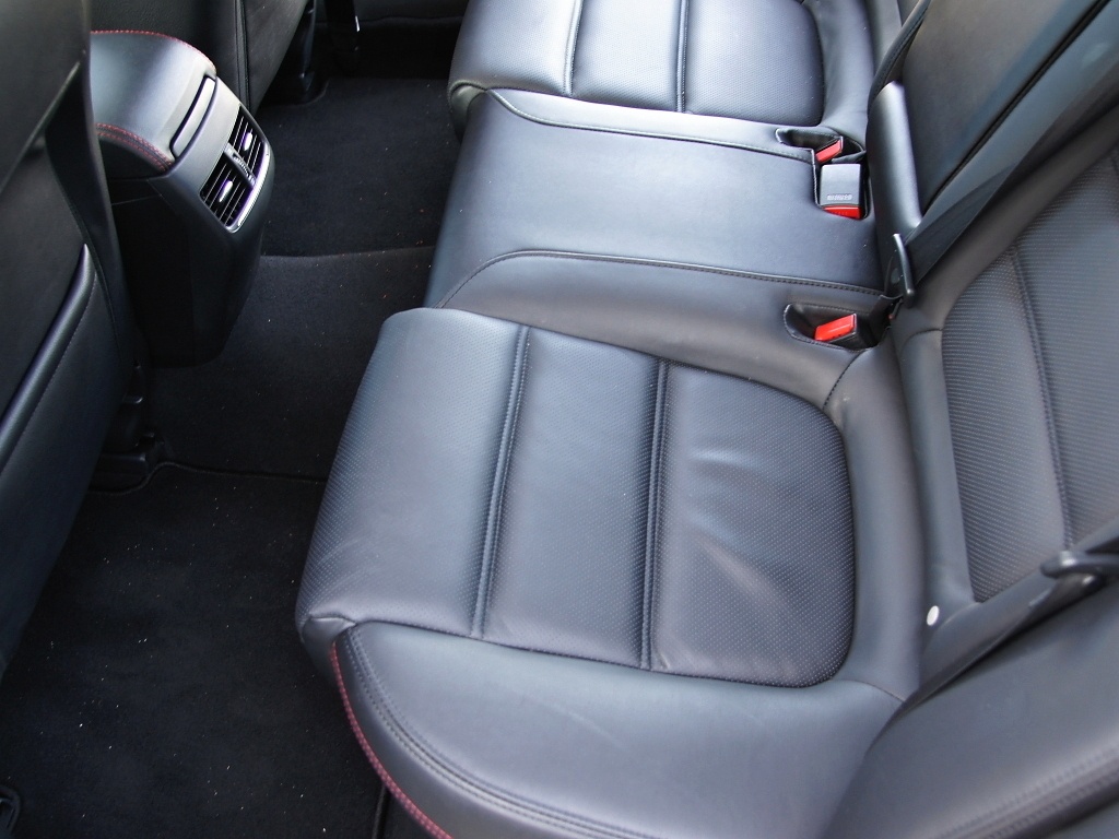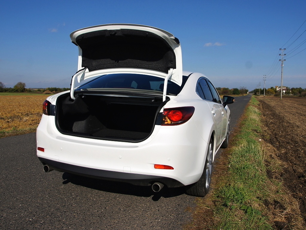 Palubní deska "šestky" je stejná jako u Mazdy CX-5, proto není nutné si ji detailněji popisovat. Navigace se společně s audiosoustavou ovládá dotykově přímo na displeji nebo pomocí joysticku, který má řidič po pravé ruce na středovém tunelu. Jediným závažnějším problémem v našich očích je audiosystém, který si nepamatuje naposledy hranou písničku z USB a vždy se Vám po opětovném startu pustí první skladba. Další otravnou věcí je pro zadní cestující příliš hlasité pípnutí při zařazení zpátečky. Posledním negativem je absence dveřního madla u spolujezdce, který se tak nemá čeho držet. Tím však výčet negativ končí, ve všech ostatních ohledech je interiér maximálně povedený. Jediné, co ještě může překvapit, je podprůměrný objem zavazadlového prostoru 489 l. Ten je dokonce o 30 litrů menší, než u minulé generace. Dlouhé předměty se dají prostrkovat do kabiny díky možnosti sklápění zadních opěradel, která se odjišťují z kufru. Sklopená sedadla bez schodu navazují na podlahu kufru, což zaslouží u sedanu velkou pochvalu.