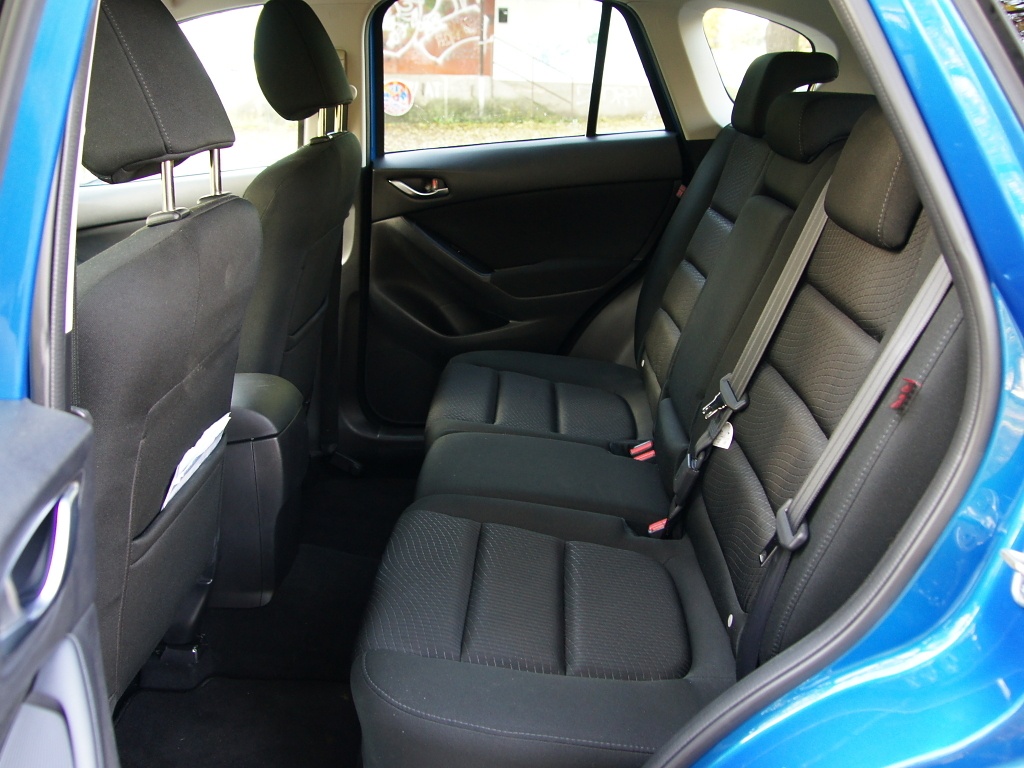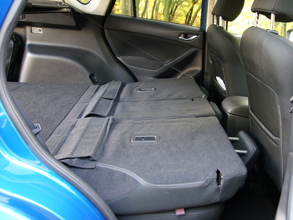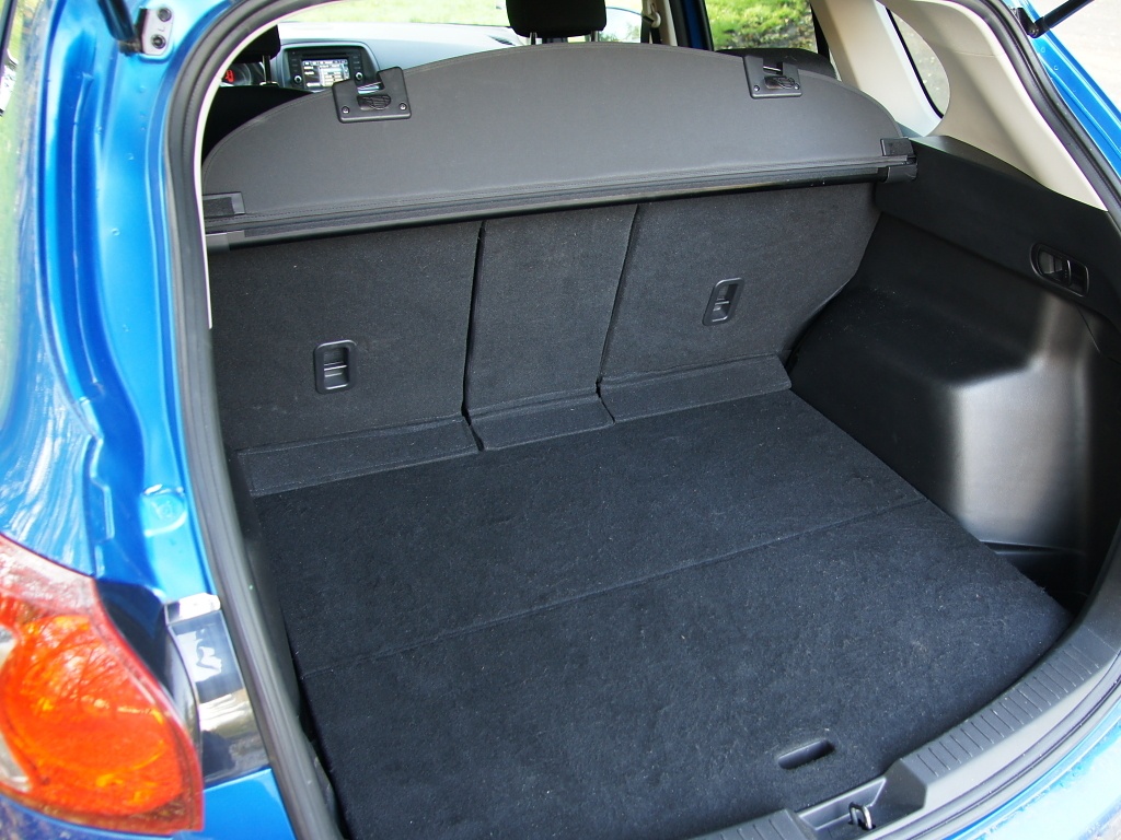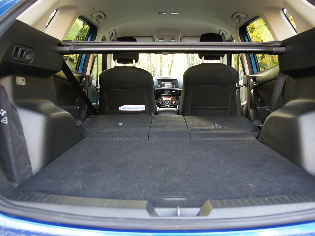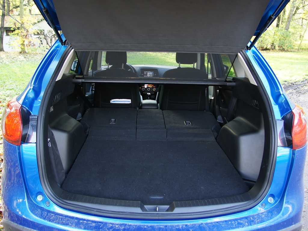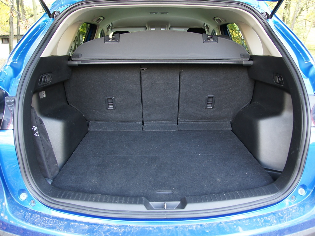 Zavazadelník pojme 503 litrů zavazadel, což je o 48 litrů více než u modelu CX-7 (přesto tato hodnota patří k pouze dobrému průměru). Zavazadelník má pravidelný tvar a je dobře využitelný (mezi podběhy je k dispozici využitelná šířka 105 cm). Základní provedení má opěradla dělená ve dvou nestejně velkých dílech v poměru 60:40 (od druhého stupně výbavy Challenge je možné velmi jednoduše sklápět zadní sedadla rozdělená na tři díly v poměru 40:20:40, přičemž s každým lze pracovat samostatně.). Sedadla lze sklopit jedním pohybem (zatažením za páku). Po sklopení vzniká téměř rovná ložná plocha. Velmi praktickým řešením usnadňující nakládání a vykládání věcí je možnost přichycení rolety na páté dveře a její automatické vyklopení po jejich otevření. Jediným nedostatkem jsou páté dveře vyklápějící se v nedostatečném úhlu (do výšky jen 183 cm nad vozovkou).