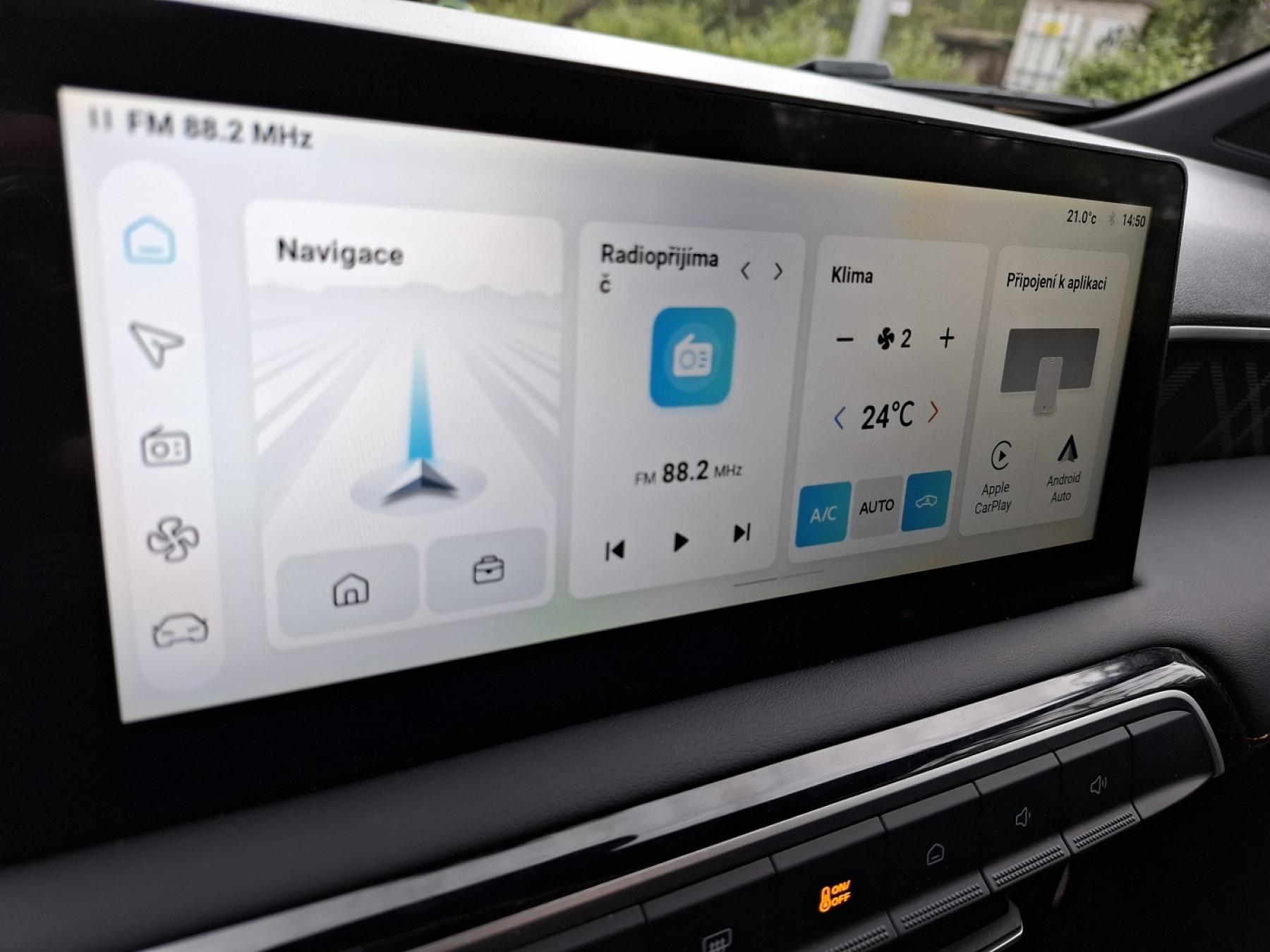 Pojďme ještě na skok do kabiny. Jedním z výrazných prvků je poměrně čistá palubní deska zahrnující dvojici obrazovek. Za volantem v kapličce najdete 7″ digitální displej, zatímco multimédiím je určen 10,25″ středový displej. Nechybí satelitní navigace ani podpora připojení chytrých telefonů přes Apple CarPlay/Android Auto včetně vestavěné aplikace ISMART lite se špičkovými funkcemi konektivity, vídanými spíše u modelů vyšších tříd.