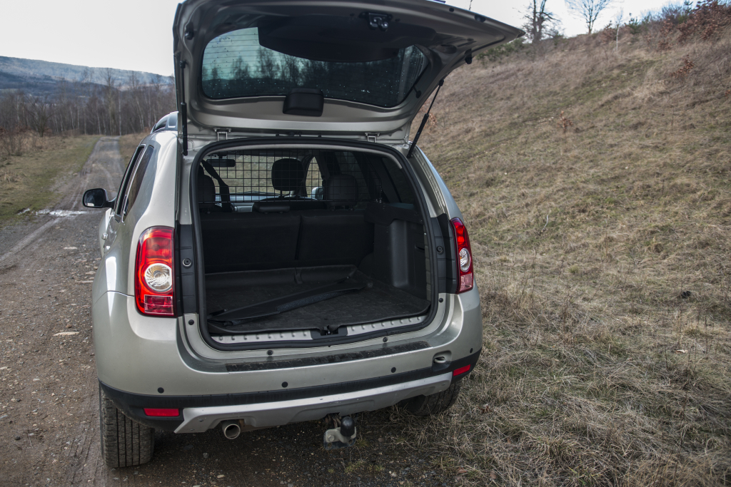 Kožená sedadla ani při nájezdu 100.000 kilometrů nekloužou, volant není oleštěný a kromě některých částí náchylnějších na odření a opotřebení tu není nic, co by vás na první pohled praštilo do očí a říkalo: „Pozor, sedíš v levném autě!“. Na českých silnicích je však situace mnohem horší. Rumunská duše se hlasitým projevem hrdě přihlásí o slovo a v Dusteru tak nechá vyniknout povrzávající díly, ale i horší odhlučnění kol a takřka brutální aerodynamický hluk v rychlostech blížících se dálničnímu limitu. 110 km/h je zřejmě proto tím nejoptimálnějším tempem, jakým lze s Dusterem cestovat a při němž si vystačí i s nečekaně nízkým přísunem paliva. O tom ale později a podrobně v kapitolách Motor a Jízda. Pojďme se teď na Dustera podívat jako na prostředek schopný odvézt nějaký ten náklad do často nedostupných končin, kam by se lidská noha trmácela několik hodin. Zavazadlový prostor 408 litrů sice neohromí (verze 4x2 má o cca 50 litrů větší zavazadelník), 1.507 litrů se sklopenými sedadly ovšem už ano. Vzhledem k tomu, že takový objem zavazadel Duster odveze, kam si jen budete přát, je to pořádná dávka nákladu.