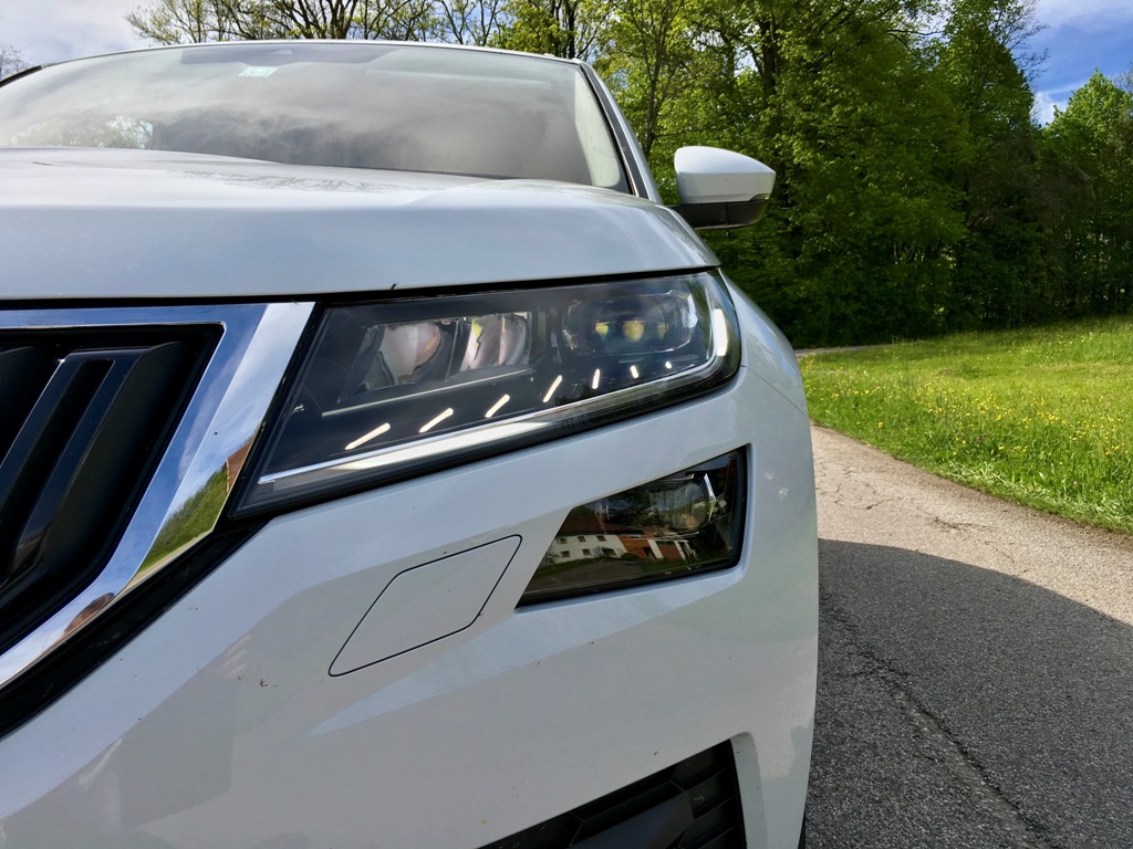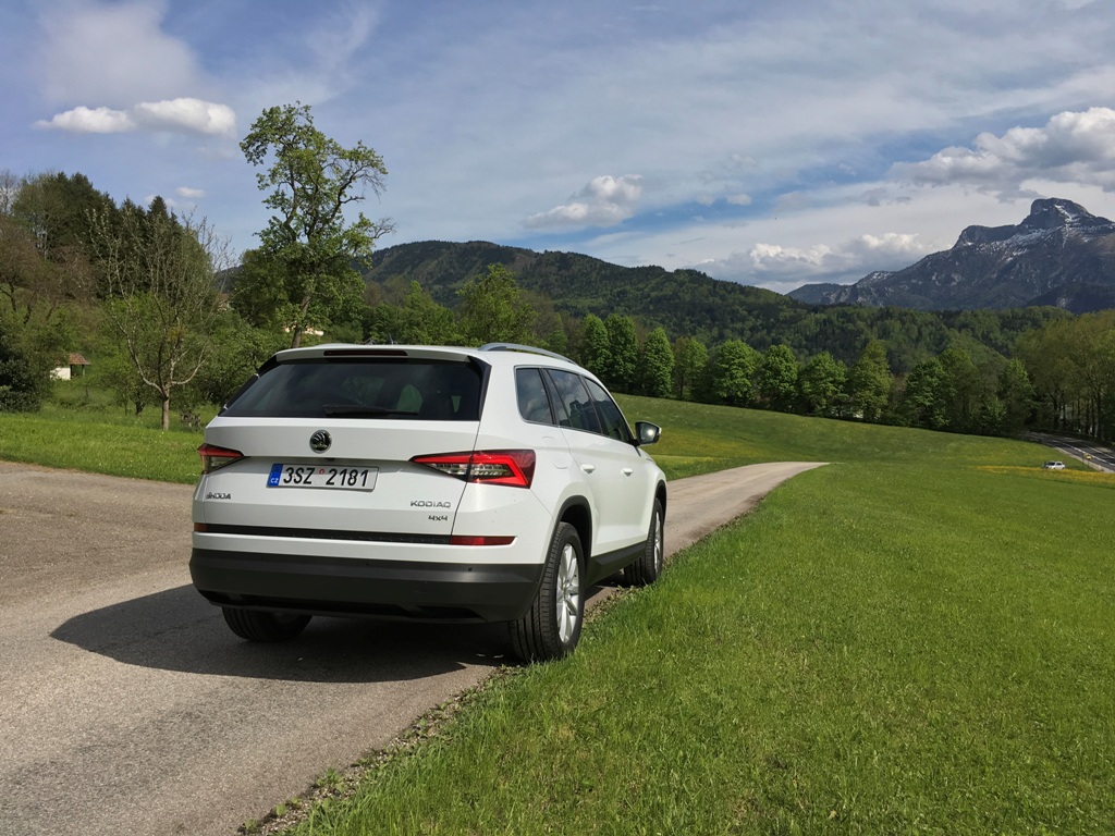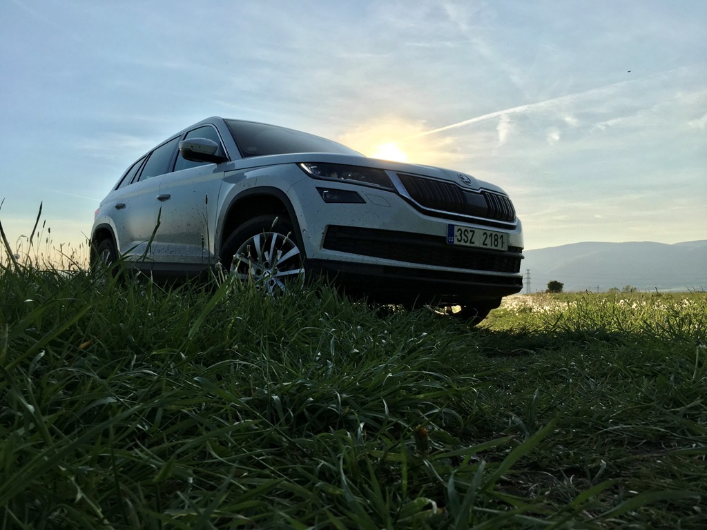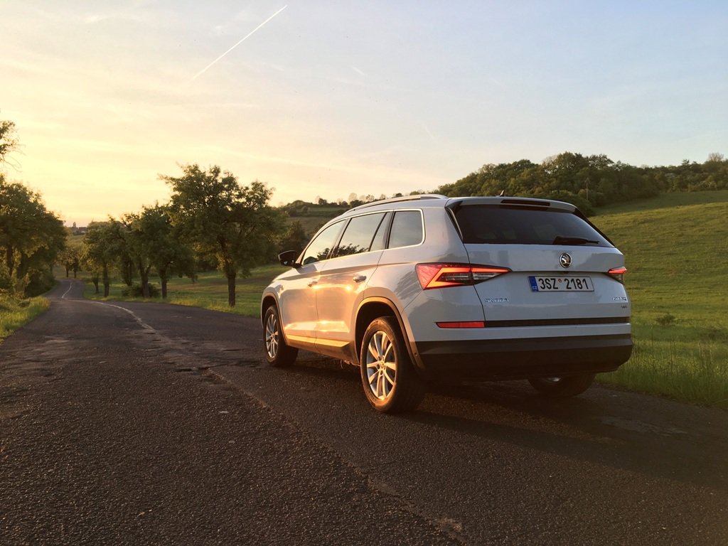 Přední část Kodiaqu působí majestátně, osobně však jeho výrazu vytýkám jisté prázdno, kterým upoutá obdélníkový vstup vzduchu pod registrační značkou (svou roli na zmiňovaném dojmu samozřejmě sehrává bílý perleťový lak). Mlhová světla jsou pousunuta hned pod přední světlomety (mimochodem veškeré vyzařované světlo obstarává technologie LED), což je jistě praktické, pokud budete vůz užívat mimo silnice. Auto působí mile, až poněkud subtilně, rozhodně mu však nechybí sebevědomí, což je u SUV považováno za samozřejmost.