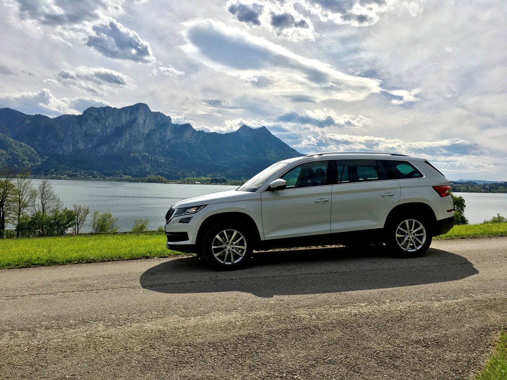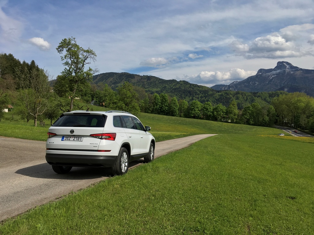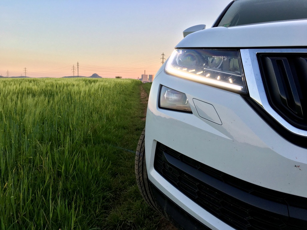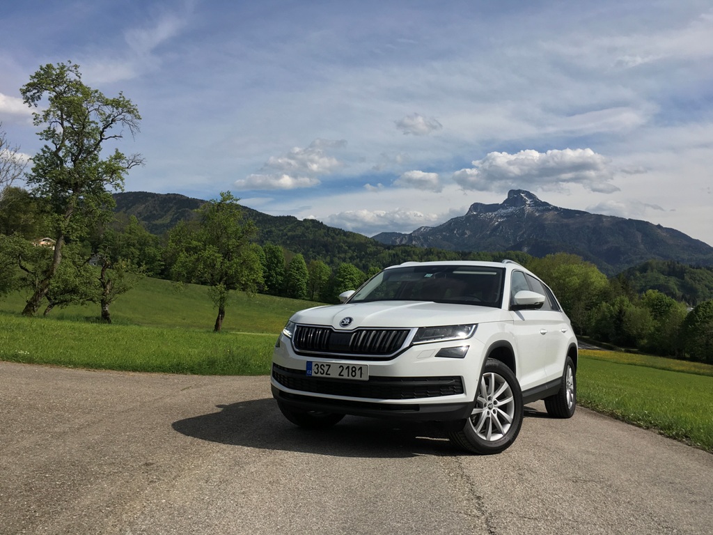 Přední část Kodiaqu působí majestátně, osobně však jeho výrazu vytýkám jisté prázdno, kterým upoutá obdélníkový vstup vzduchu pod registrační značkou (svou roli na zmiňovaném dojmu samozřejmě sehrává bílý perleťový lak). Mlhová světla jsou pousunuta hned pod přední světlomety (mimochodem veškeré vyzařované světlo obstarává technologie LED), což je jistě praktické, pokud budete vůz užívat mimo silnice. Auto působí mile, až poněkud subtilně, rozhodně mu však nechybí sebevědomí, což je u SUV považováno za samozřejmost.