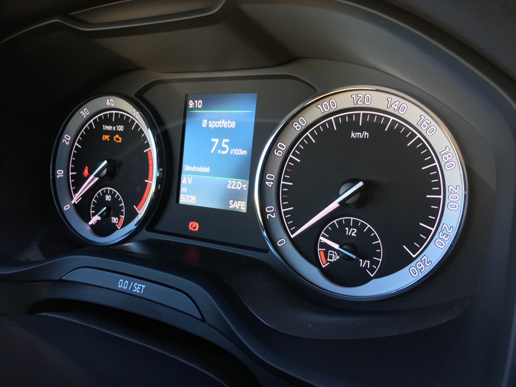 Na digitální přístrojový štít si bude Kodiaq muset ještě počkat, skleněný displej uprostřed ale mnohé dohání. Funguje brilantně, je čitelný i na přímém slunci a zobrazované údaje jsou intuitivně rozmístěny (u Škody standardem), ke kapličce přístrojů se ale musím ještě jednou vrátit. A nepůjde o nic pozitivního. Nevadí mi, že zde v rámci pokrokovosti není displej, mechanické ručičky mám rád, proč ale návrháři použili takovéto budíky? Připomínají Octavii RS první generace (možná to byl záměr), co je však horší, bílé číslice zůstaly umístěny v šedém poli, kde na ně není moc vidět. Namísto aktuální spotřeby, navigace, nebo čehokoliv jiného tak raději volím aktuální rychlost i na barevném MaxiDotu (ten výraz mi bude chybět, musel jsem...) mezi budíky.