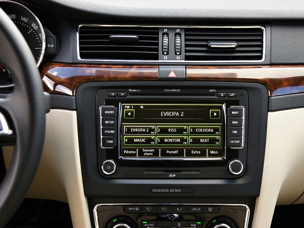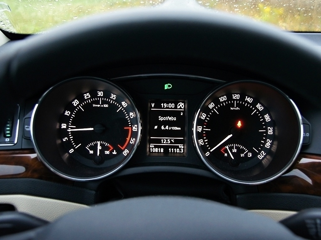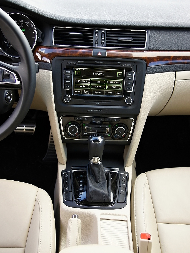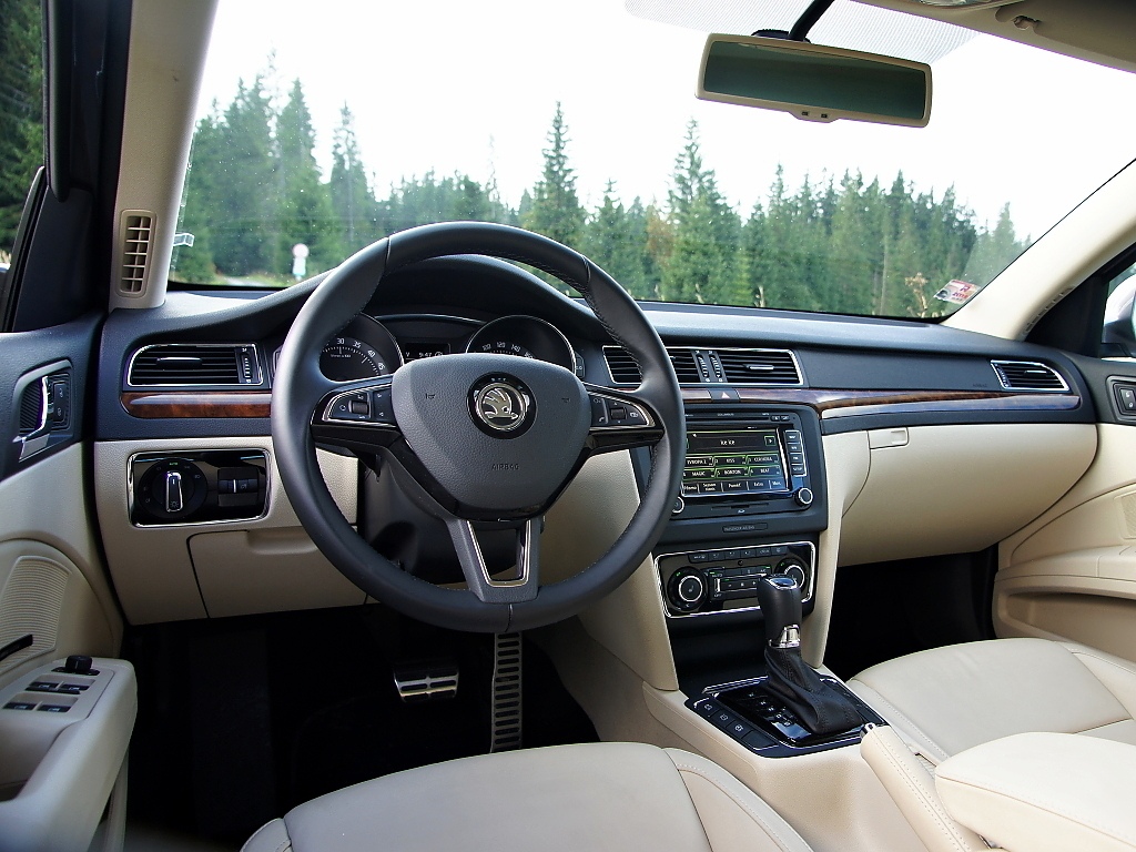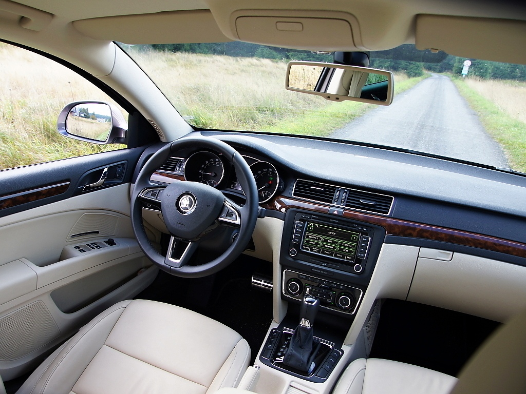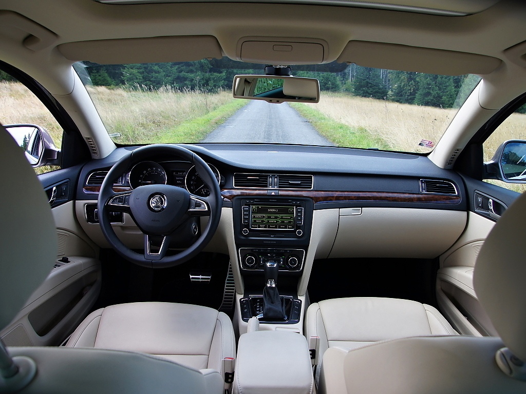 Interiér Superbu přes své stáří působí harmonicky a uchovává si "klubovou atmosféru". Materiály jsou prvotřídní, stejně tak slícování a provedení. Ve srovnání s novou Octavií působí Superb stále o třídu výše. Stáří je však znát na středovém panelu, kde v testovaném voze pracoval Columbus. Oproti trojkové Octavii je displej menší, ovládání méně logické a grafika působí zastarale. V tomto ohledu je Octavia prostě o kus dále. Stejně tak se po modernizaci nedostaly do Superbu asistenční systémy jako hlídání mrtvého úhlu nebo udržování jízdního pruhu. Kabina Superbu přesto stále působí důstojně.