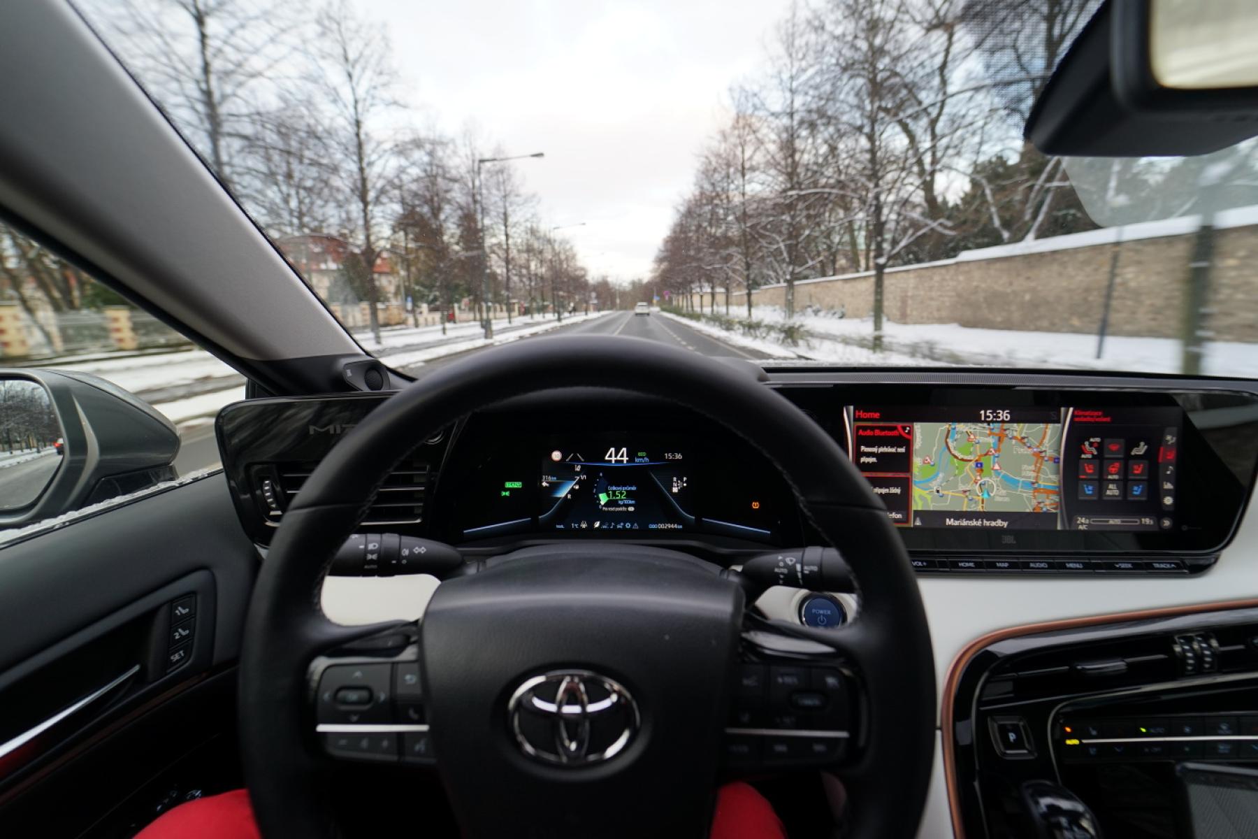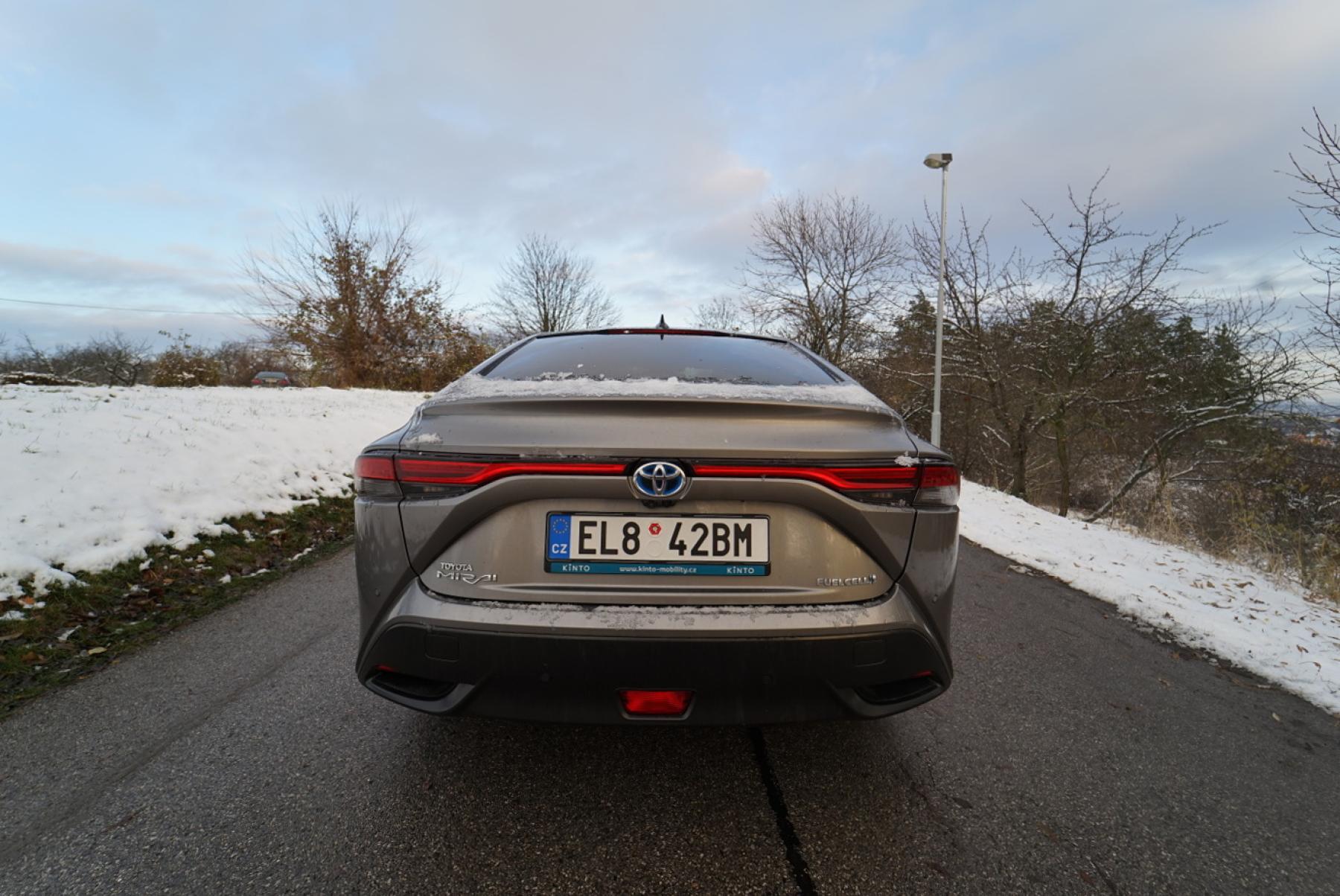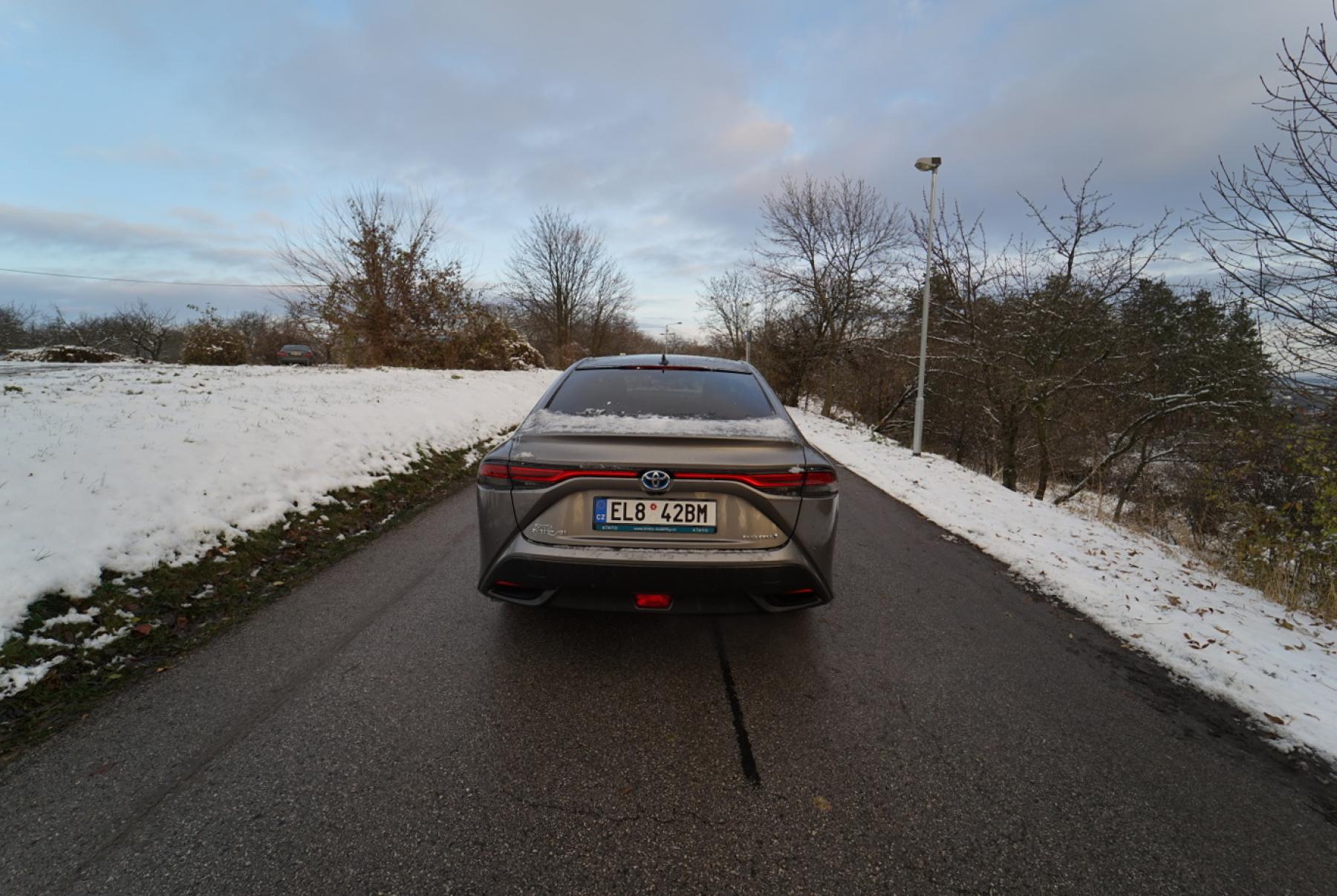 Během testovacího týdne navíc napadl sníh a my neváhali ani chvilku a vyrazili zkoušet schopnosti vodíkového vozu. Mirai obutý do nových dvacetipalcových zimáků od Pirelli byl na sněhové pokrývce výtečným společníkem. Pohon zadních kol nás ani trochu nelimitoval ani netrápil. Stačilo sešlápnout plynový pedál a vůz se i v prudších stoupáních vždy dal plynule do pohybu. Žádné protáčení kol ani házení zádi. Stabilní chování zaručovalo bezpečnou plavbu. A pokud vypnete stabilizaci, můžete si s pětimetrovým sedanem užívat pohonu zadních kol (automobilce se podařilo dosáhnout téměř ideálního rozložení hmotnosti mezi nápravy).