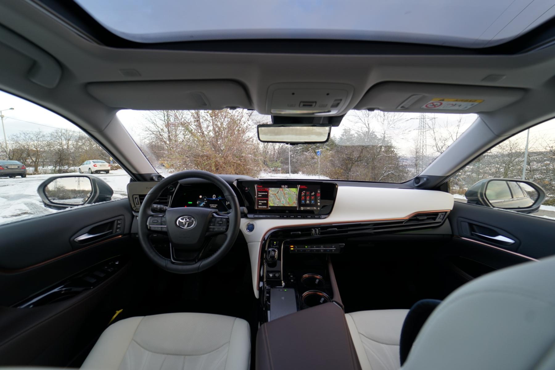 Ač se Toyota Mirai prezentuje jako pětimístná, v praxi ji využij pouze čtyři cestující (na vině je široký středový tunel táhnoucí se celou kabinou a skrývající vodíkovou nádrž). Přední i zadní sedadla mohou být vybavena výhřevem i ventilací a přizpůsobitelné osvětlení dává na výběr z osmi barevných odstínů. O bezpečnost při jízdě se stará několik bezpečnostních systémů včetně aktivního systému zatáčení ACA, adaptivního tempomatu nebo plně automatického parkování, které se mezi modely Toyoty objevuje vůbec poprvé. Speciální akustický systém pak generuje zvuk vozu při akceleraci.