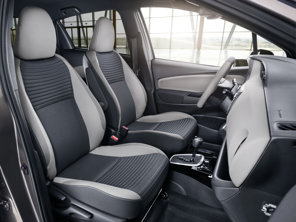 Interiér verze Bi-Tone zahrnuje černý potah stropu kabiny sladěný s odstínem laku střechy. Prostřednictvím dvoubarevného lakování Bi-Tone umožňuje Toyota každému zájemci, aby si nakonfiguroval Yaris podle vlastního vkusu.
