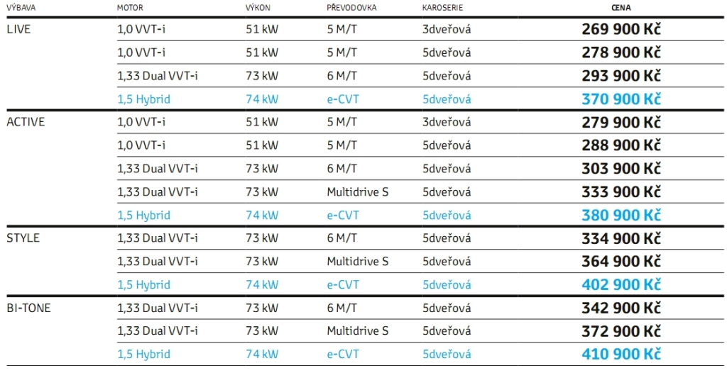 Populární model Yaris japonské automobilky dostal pro rok 2016 bezpečnostní paket Safety Sense, nový stupeň výbavy Style či možnost dvoubarevného lakování karoserie Bi-Tone. Pořizovací ceny začínají na 269 900 Kč, přičemž za stále žádanější hybridní verzi je nutné připlatit nemalých 101 000 Kč.