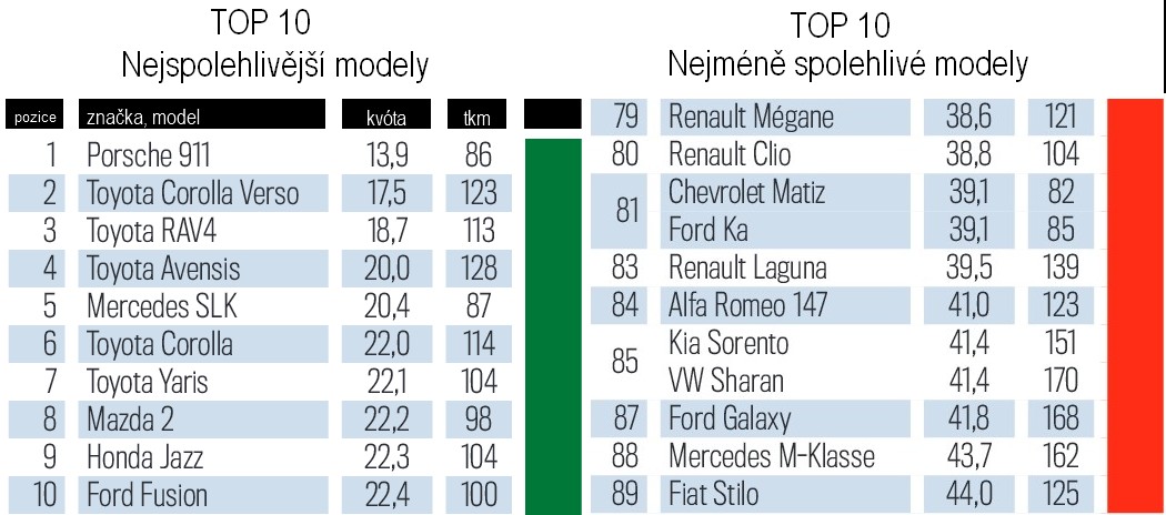 Na druhé příčce skončila Toyota Corolla Verso (17,5 % závažných závad a v průměru najeto 123 tisíc km), na třetí Toyota RAV4, na čtvrté Toyota Avensis a na páté Mercedes SLK. Šestá pak byla opět japonská Toyota, tentokráte díky klasickému modelu Toyota Corolla, následovaná na sedmé pozici menší Toyotou Yaris. Osmé místo získala Mazda 2, deváté Honda Jazz. První desítku uzavírá Ford Fusion.