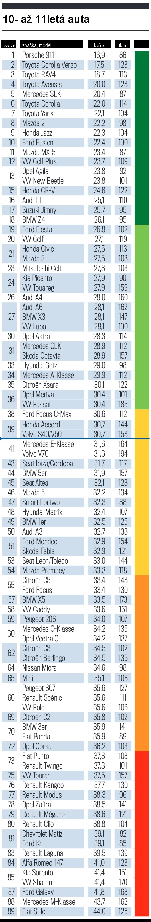 Dnes se zaměříme na nejstarší sledovaná auta, tzn. na desetiletá až jedenáctiletá auta (kompletní výsledky této kategorie naleznete zde). V této kategorii si úplně nejlépe vede sportovní model Porsche 911 typ 996, která s s kvótou 13,9 % nechala veškeré ostatní automobily za sebou a patří k nejméně problémovým automobilům při STK. Minimum závad u Porsche si lze snadno vysvětlit nižší kilometrovým proběhem (průměrně 86 tisíc km) a daleko lepší péčí, kterou majitelé těmto vozům věnují.