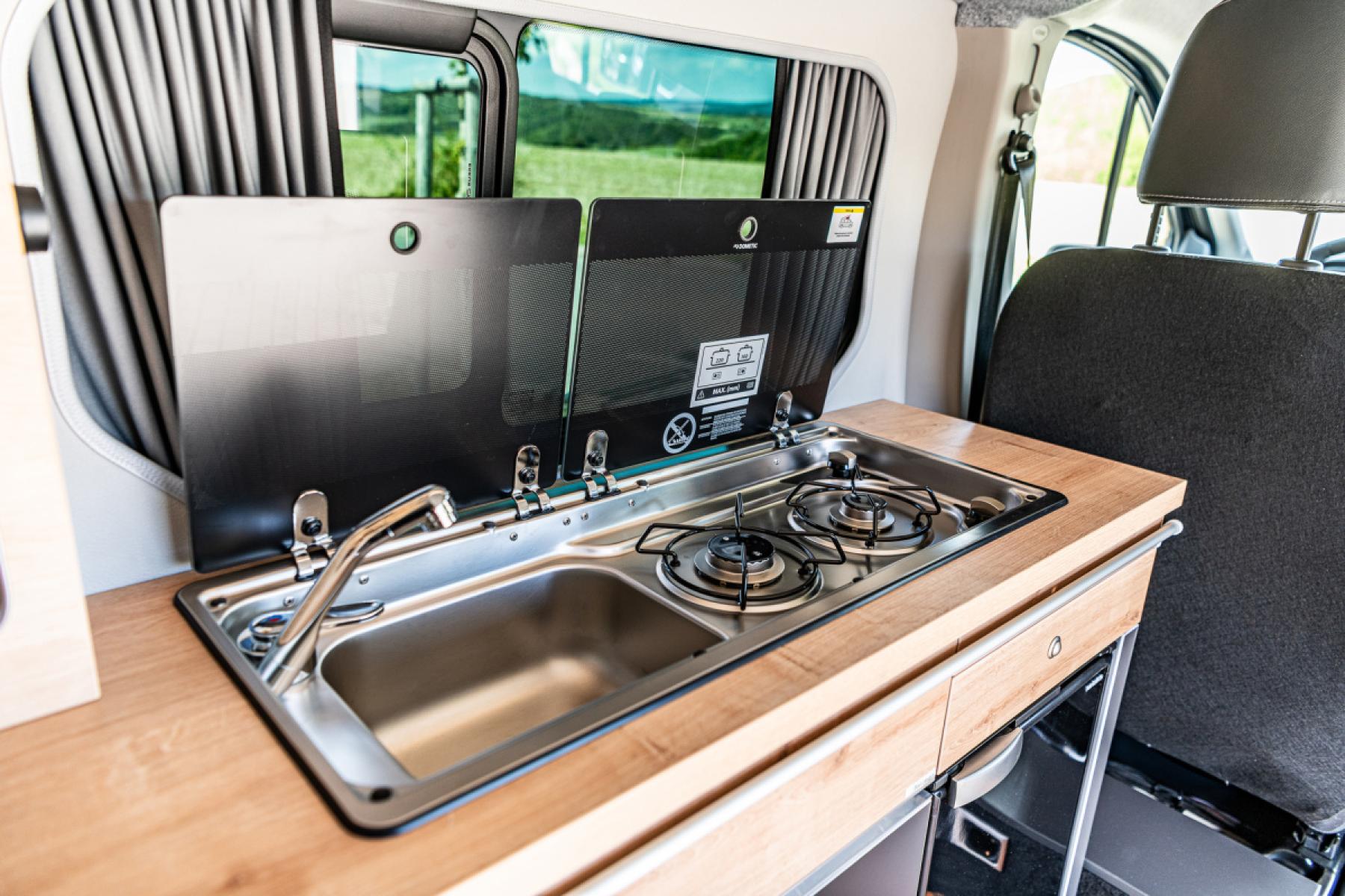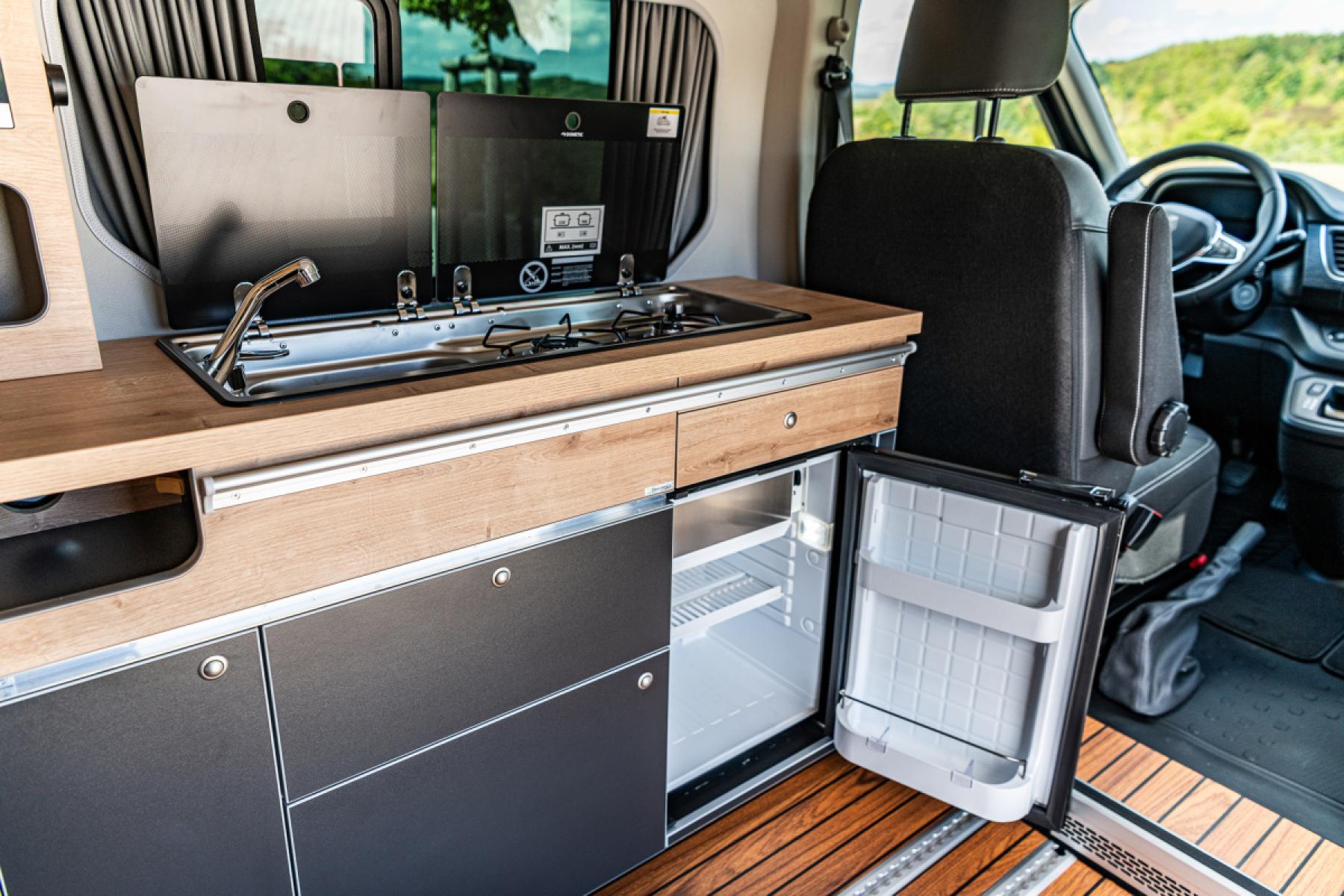Wavecamper poskytne pohodlný prostor na pobyt uvnitř a množství výhod, jako například stůl a dodatečný elektrický systém, díky kterým v něm lze i pohodlně pracovat.