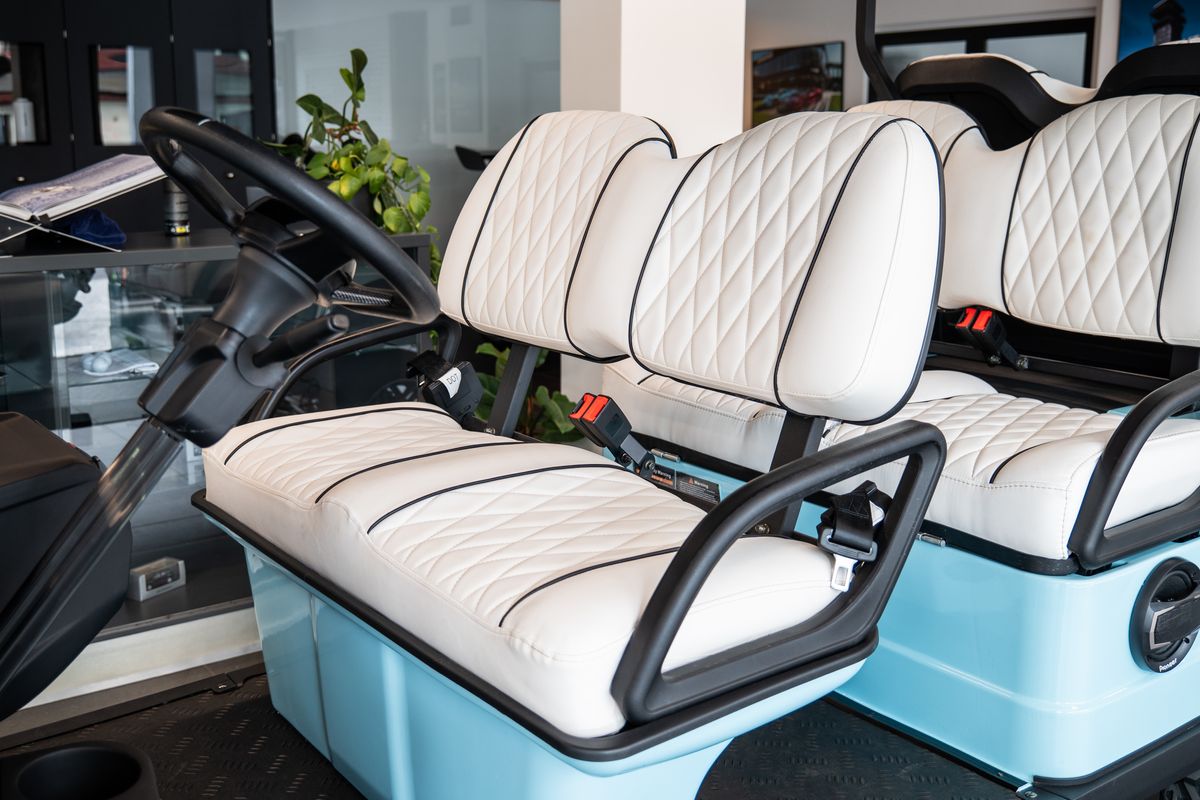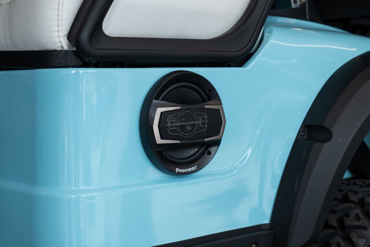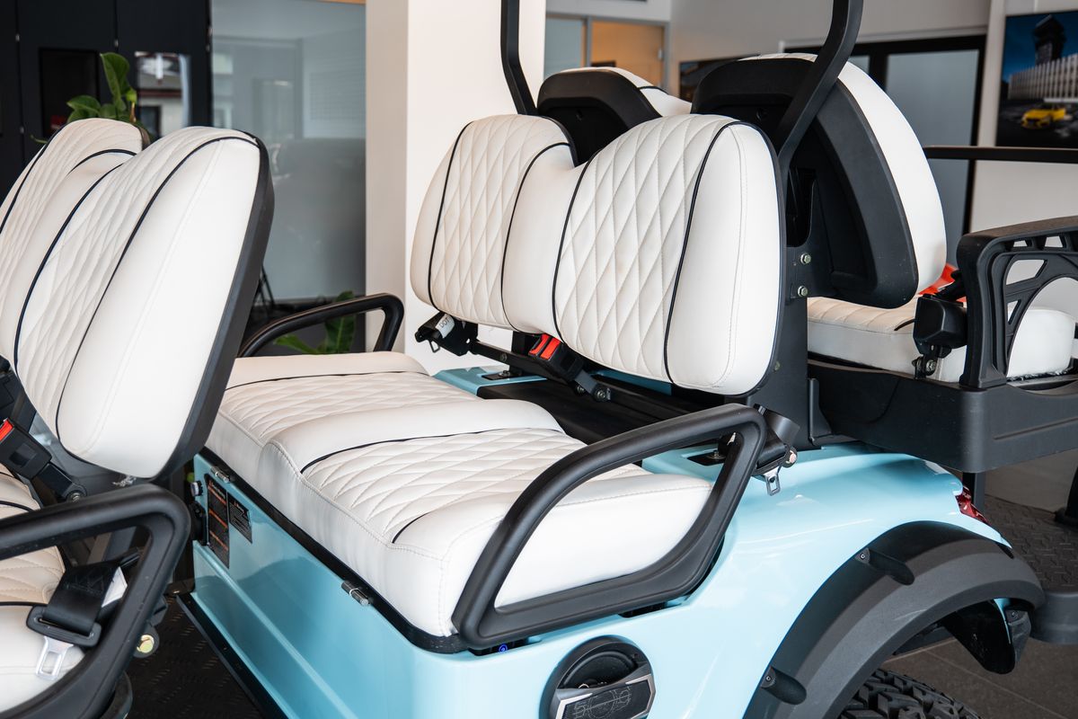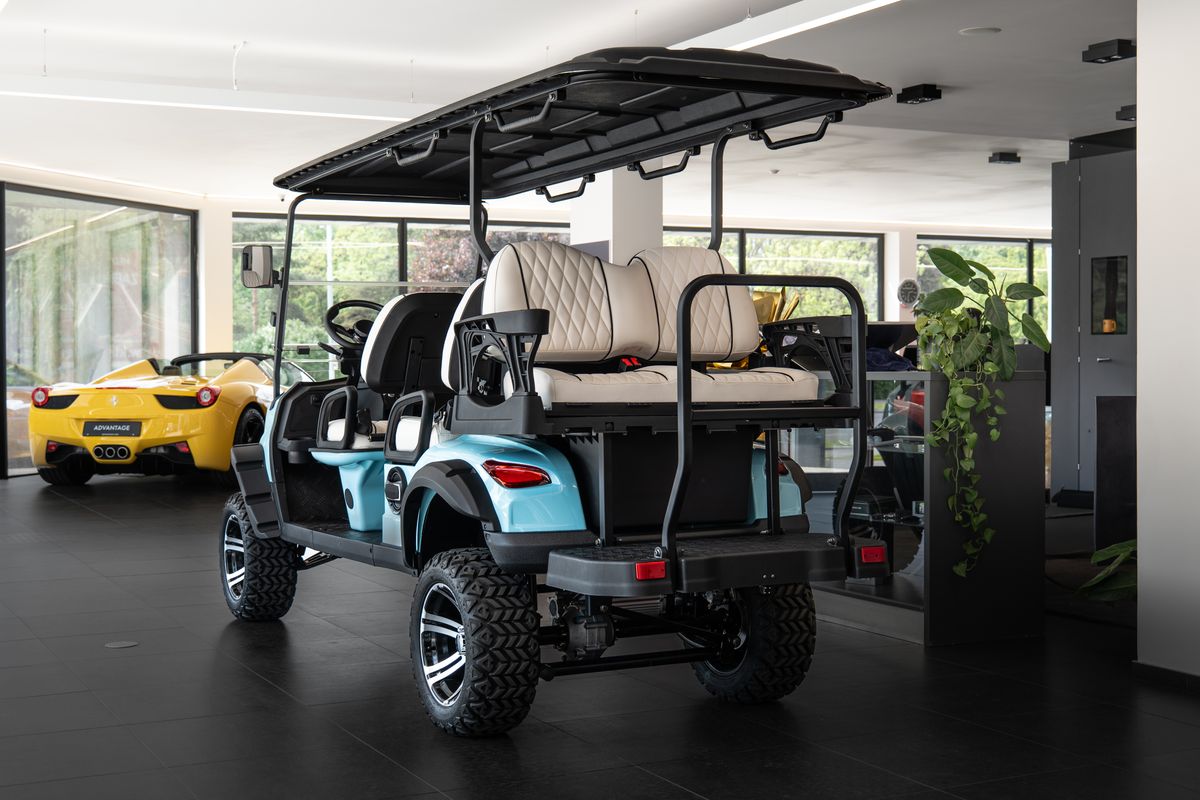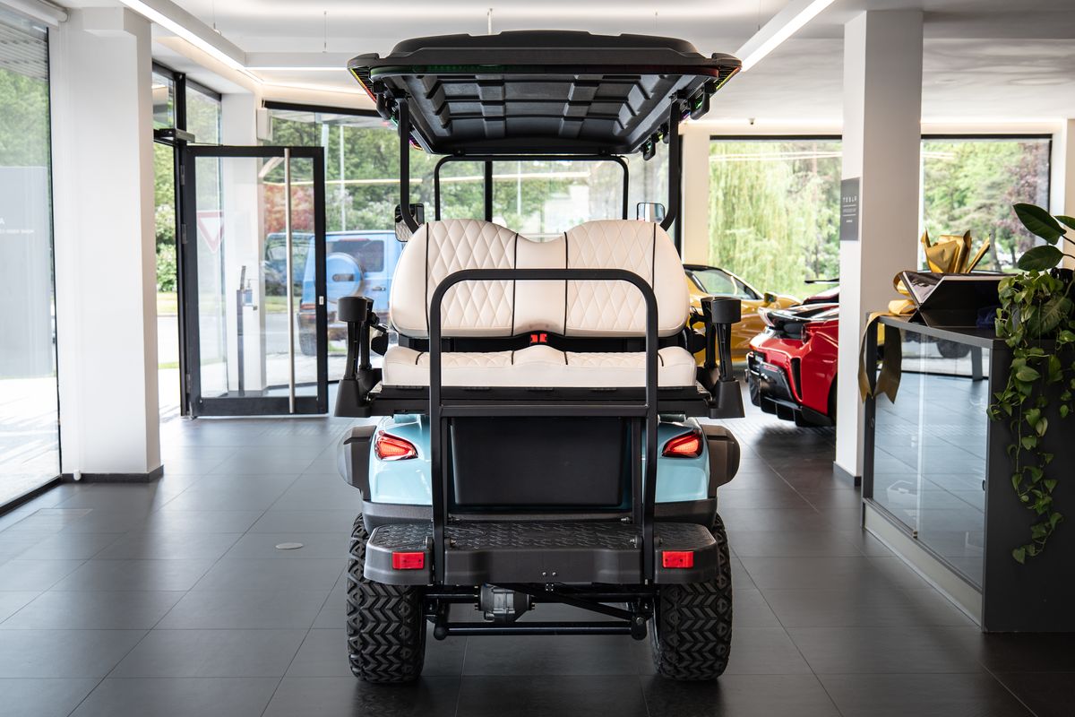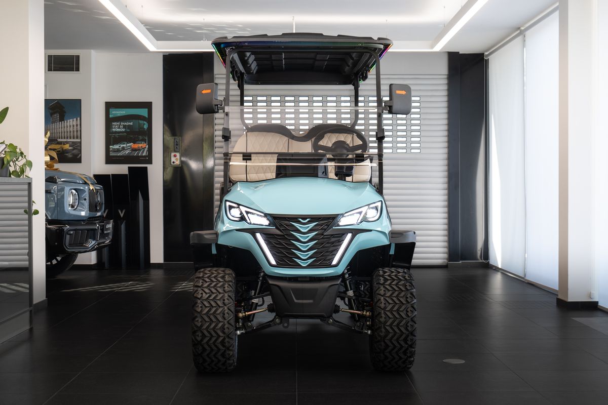Dojezd 120 km, Maximální rychlost: 30 km/h, Maximální stoupavost: 15 %, Hmotnost bez nákladu: 680 kg, Rozměry: 3680 × 1350 × 2100 mm, Světlá výška: 240 mm, Rozvor: 2440 mm, Rozchod předních kol: 900 mm, Rám z vysokopevnostní oceli, Lithiová baterie 72V / 115Ah, Motor: střídavý, 5 kW, Řídicí jednotka: Enpower, Pneumatiky 23×10.5–14, Nabíjení 220V, 10 LED přístrojový panel, Zrcátko s integrovaným směrovým světlem, Výstražný tón při couvání, Couvací kamera / obraz při couvání, LED světlomety / potkávací světla / dálková světla, Elektrická parkovací brzda (EPB), Bluetooth audio systém, Chladicí box, Bezpečnostní pásy certifikované podle normy DOT, Barva vozíku: světle modrá, Barva sedadel: bílá, LED podsvícení pod vozíkem a na střeše