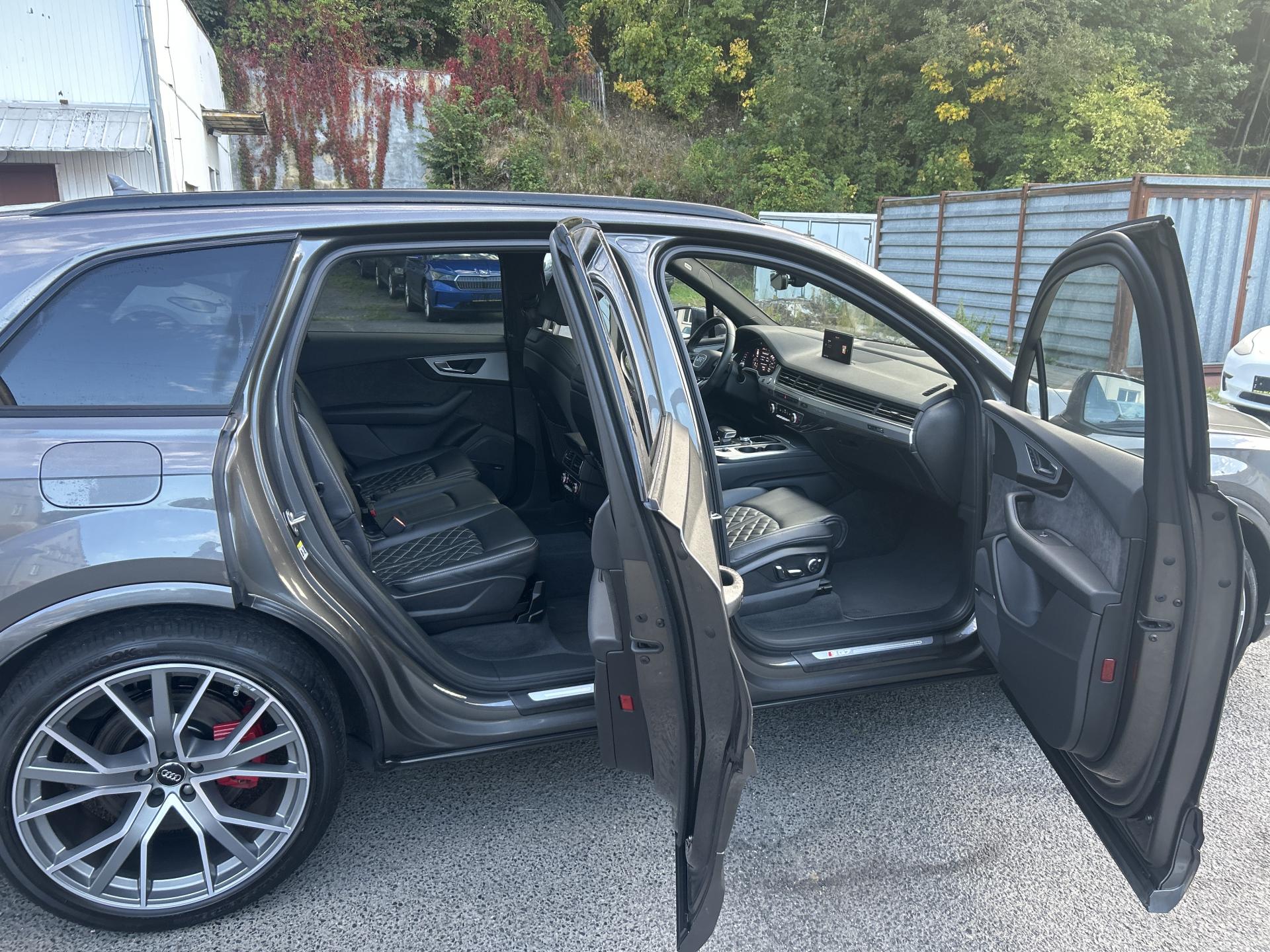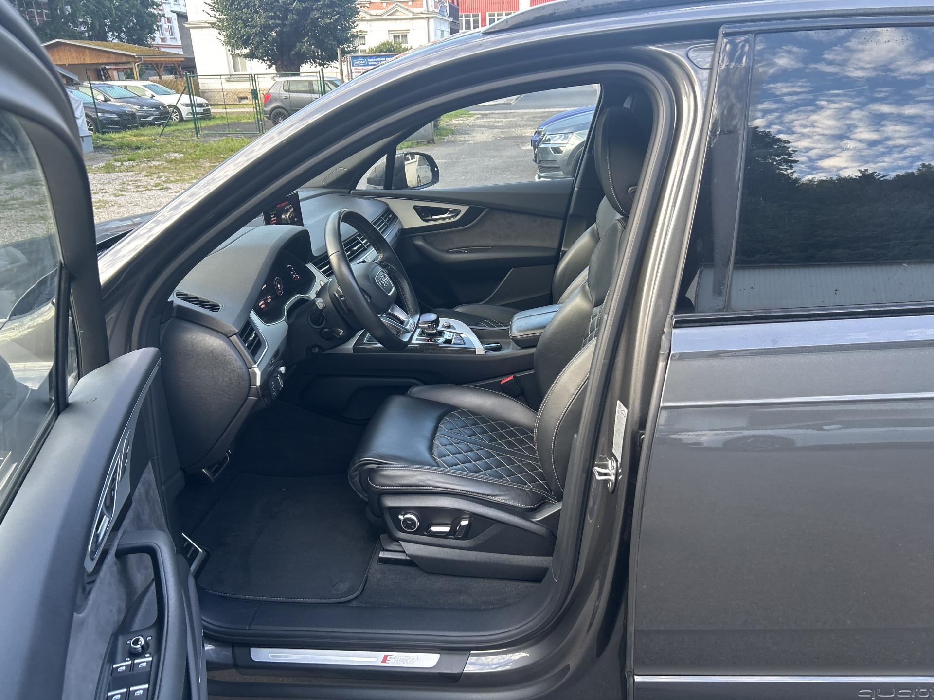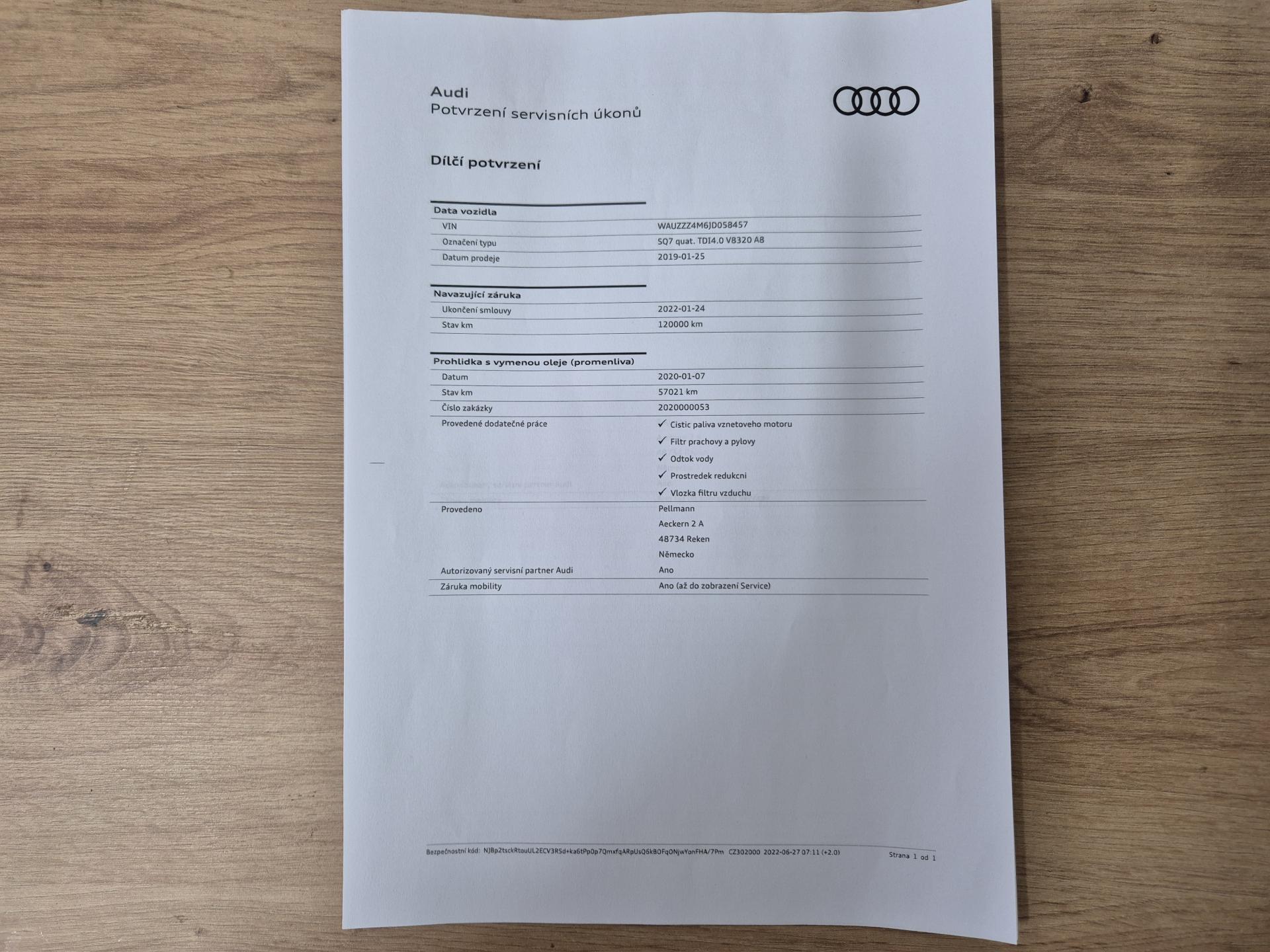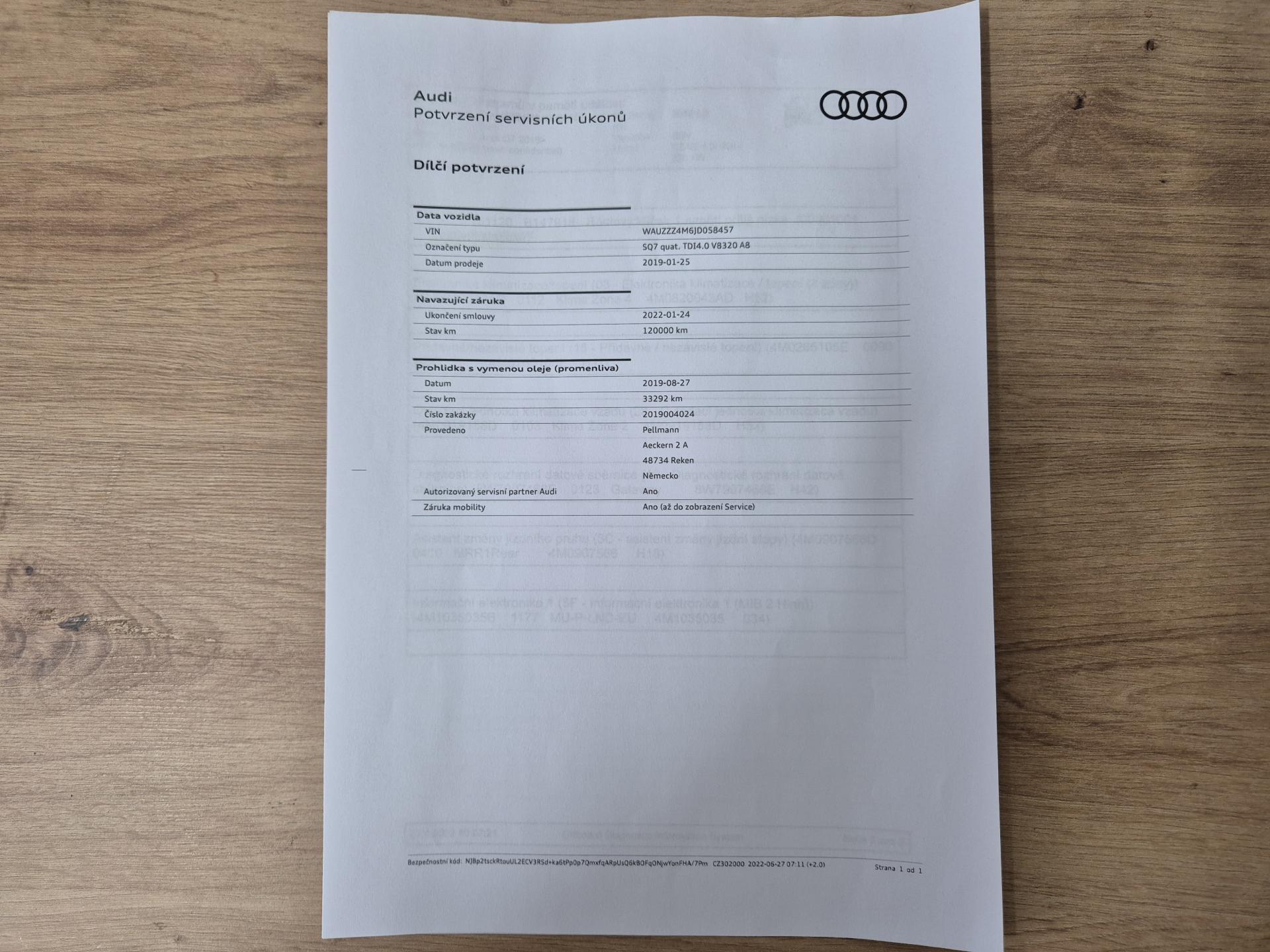 VIN: WAUZZZ4M6JD058457, výbava SQ7, 1. reg. 25.01.2019, 20ALU, černá kůže Valcona s kosočtverci, 4x vyhřívané sedačky, sat. navigace MMI + KAMERA + AREA VIEW + BOSE + TV Tuner, LED-MATRIX, F1, TZ, ACTIVE LANE, SIDE, LIGHT, PARK, FRONT ASSIST/ACC, PANORAMA, Virtual Cockpit, Keylless-Go + Soft Close, Webasto na DO, vzduchový podvozek sport - Paket Advanced (natáčecí náprava, sportdiferenciál, aktivní podvozek), noční vidění, Head Up, Audi Black paket. Prodávající prohlašuje, že pokud bude po uzavření této kupní smlouvy jakýmkoliv způsobem shledáno (např. společností CEBIA s.r.o. nebo např. Policií ČR), že původ vozu, stav kilometrů (od předešlého majitele) a zápisy v servisní knize nesouhlasí s provedenými kontrolami bude kupujícímu prodávajícím vrácena plná výše kupní ceny ihned. Za příplatek 1-3 roky záruka na vozidlo. Termín prohlídky vozidla nutno domluvit předem !