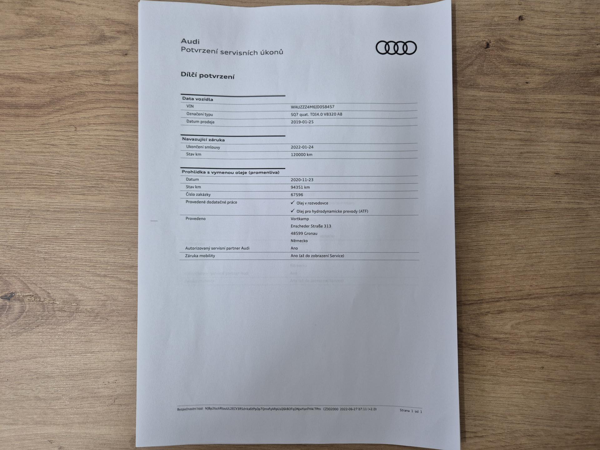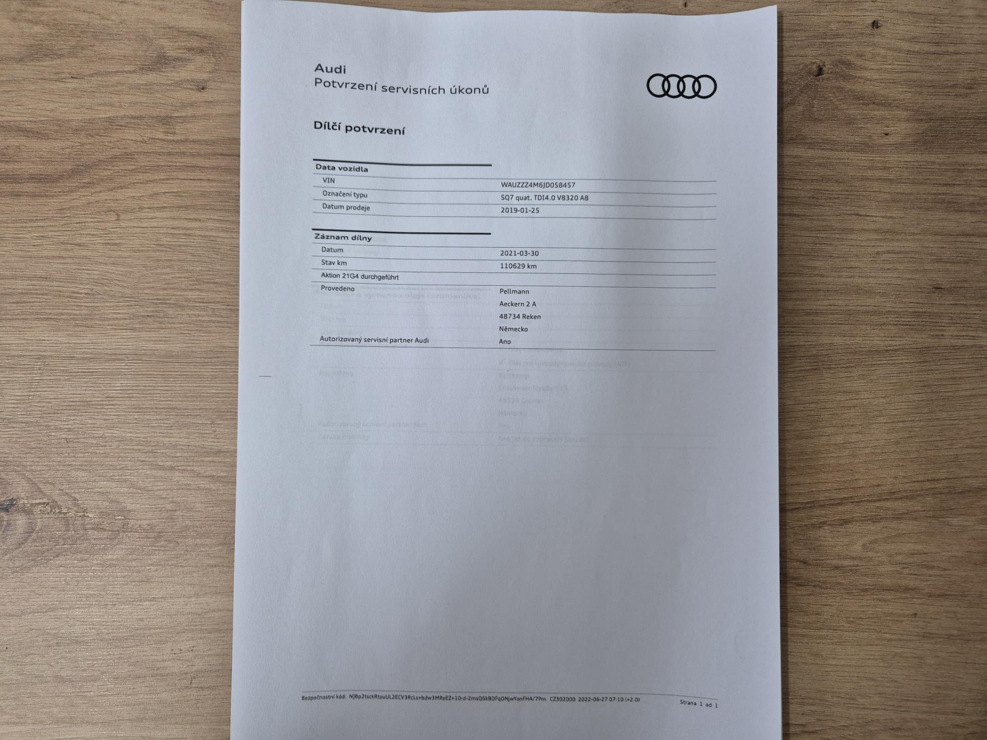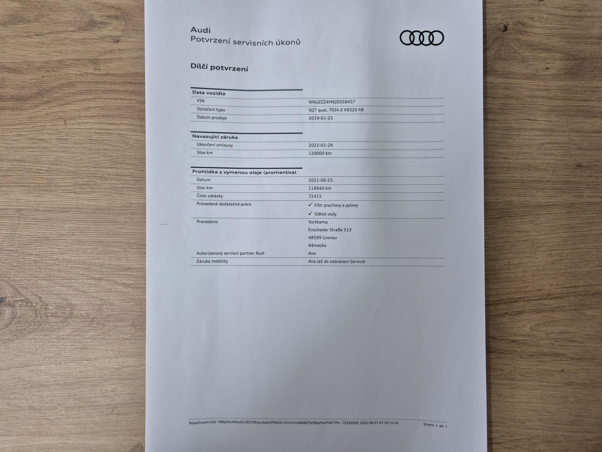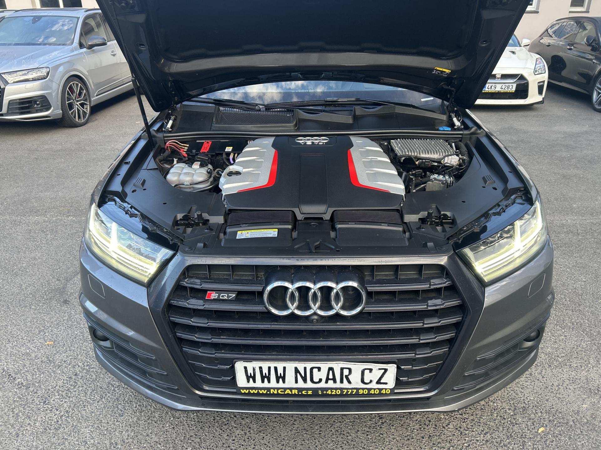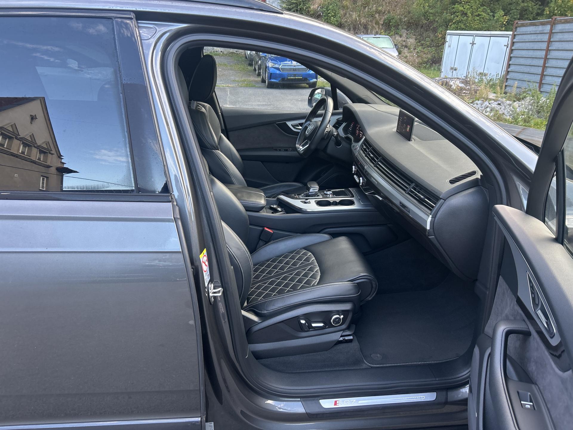 VIN: WAUZZZ4M6JD058457, výbava SQ7, 1. reg. 25.01.2019, 20ALU, černá kůže Valcona s kosočtverci, 4x vyhřívané sedačky, sat. navigace MMI + KAMERA + AREA VIEW + BOSE + TV Tuner, LED-MATRIX, F1, TZ, ACTIVE LANE, SIDE, LIGHT, PARK, FRONT ASSIST/ACC, PANORAMA, Virtual Cockpit, Keylless-Go + Soft Close, Webasto na DO, vzduchový podvozek sport - Paket Advanced (natáčecí náprava, sportdiferenciál, aktivní podvozek), noční vidění, Head Up, Audi Black paket. Prodávající prohlašuje, že pokud bude po uzavření této kupní smlouvy jakýmkoliv způsobem shledáno (např. společností CEBIA s.r.o. nebo např. Policií ČR), že původ vozu, stav kilometrů (od předešlého majitele) a zápisy v servisní knize nesouhlasí s provedenými kontrolami bude kupujícímu prodávajícím vrácena plná výše kupní ceny ihned. Za příplatek 1-3 roky záruka na vozidlo. Termín prohlídky vozidla nutno domluvit předem !