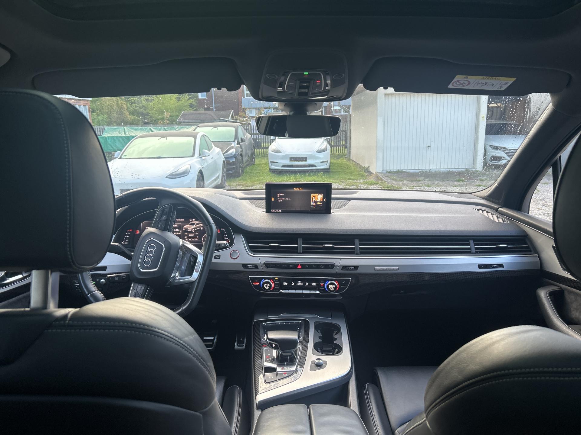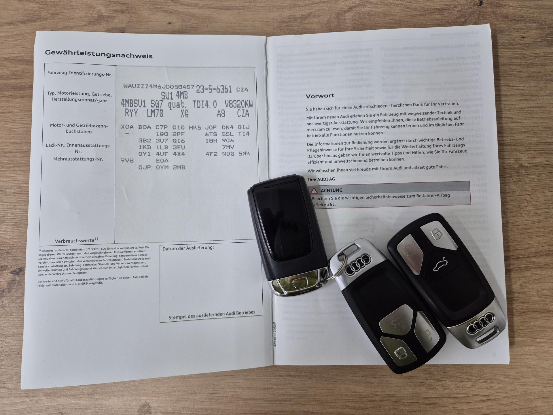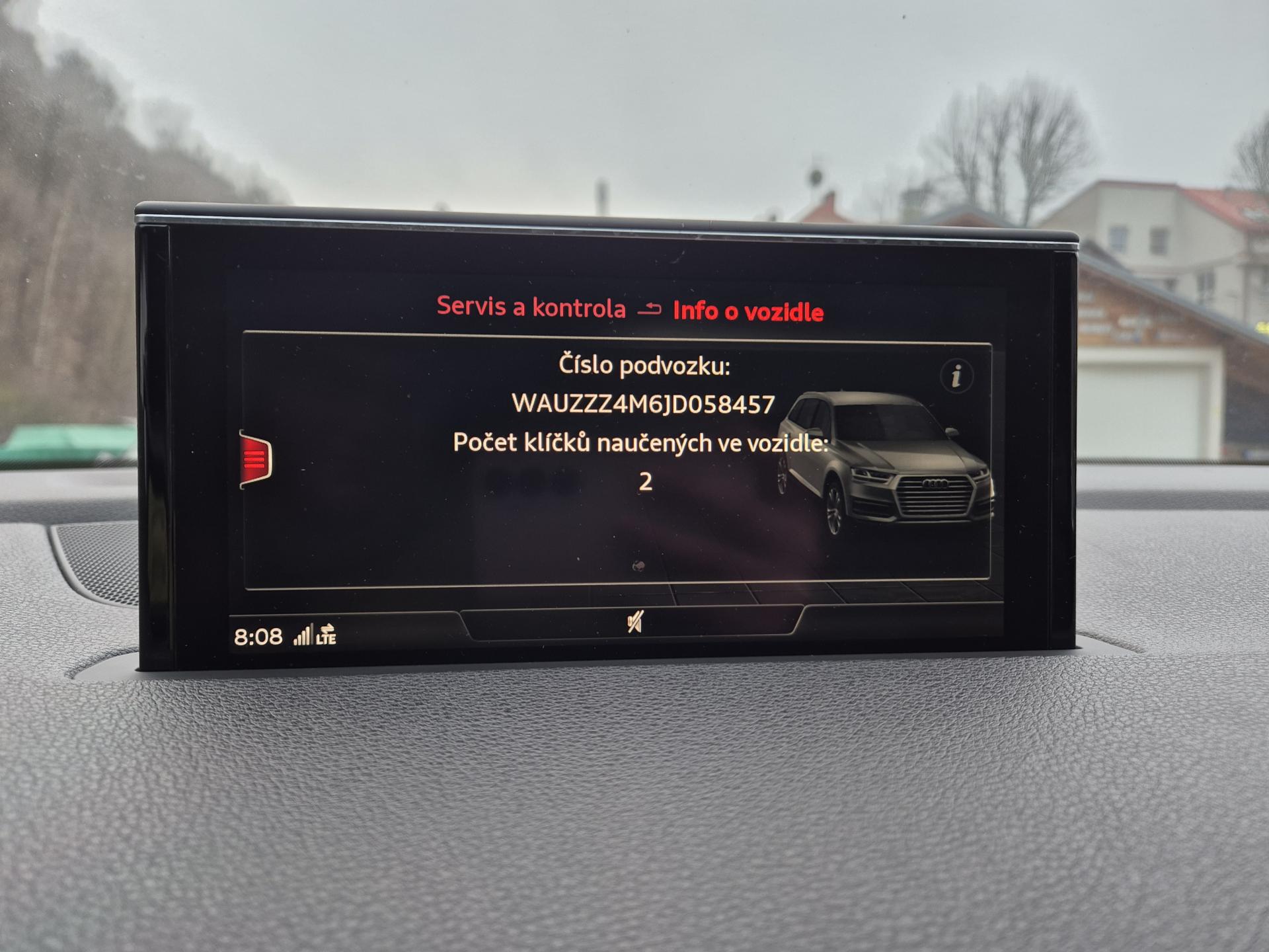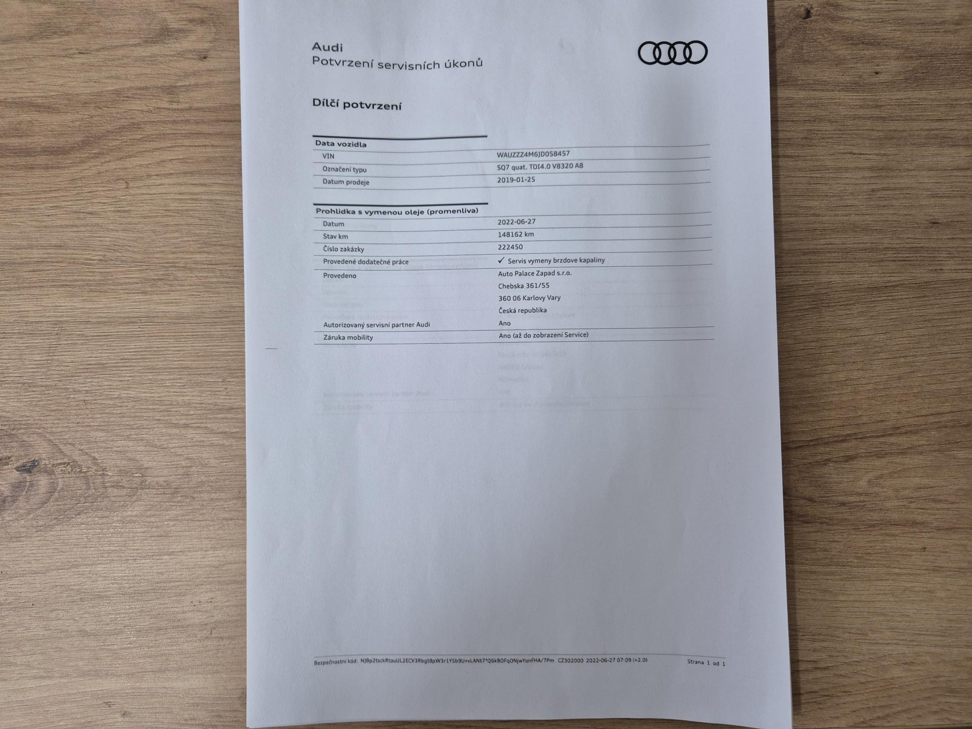 VIN: WAUZZZ4M6JD058457, výbava SQ7, 1. reg. 25.01.2019, 20ALU, černá kůže Valcona s kosočtverci, 4x vyhřívané sedačky, sat. navigace MMI + KAMERA + AREA VIEW + BOSE + TV Tuner, LED-MATRIX, F1, TZ, ACTIVE LANE, SIDE, LIGHT, PARK, FRONT ASSIST/ACC, PANORAMA, Virtual Cockpit, Keylless-Go + Soft Close, Webasto na DO, vzduchový podvozek sport - Paket Advanced (natáčecí náprava, sportdiferenciál, aktivní podvozek), noční vidění, Head Up, Audi Black paket. Prodávající prohlašuje, že pokud bude po uzavření této kupní smlouvy jakýmkoliv způsobem shledáno (např. společností CEBIA s.r.o. nebo např. Policií ČR), že původ vozu, stav kilometrů (od předešlého majitele) a zápisy v servisní knize nesouhlasí s provedenými kontrolami bude kupujícímu prodávajícím vrácena plná výše kupní ceny ihned. Za příplatek 1-3 roky záruka na vozidlo. Termín prohlídky vozidla nutno domluvit předem !