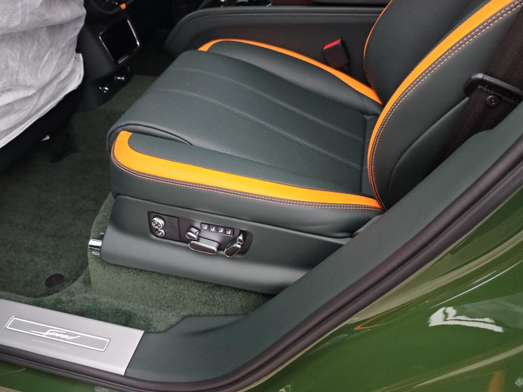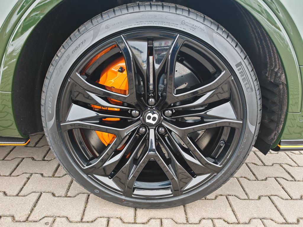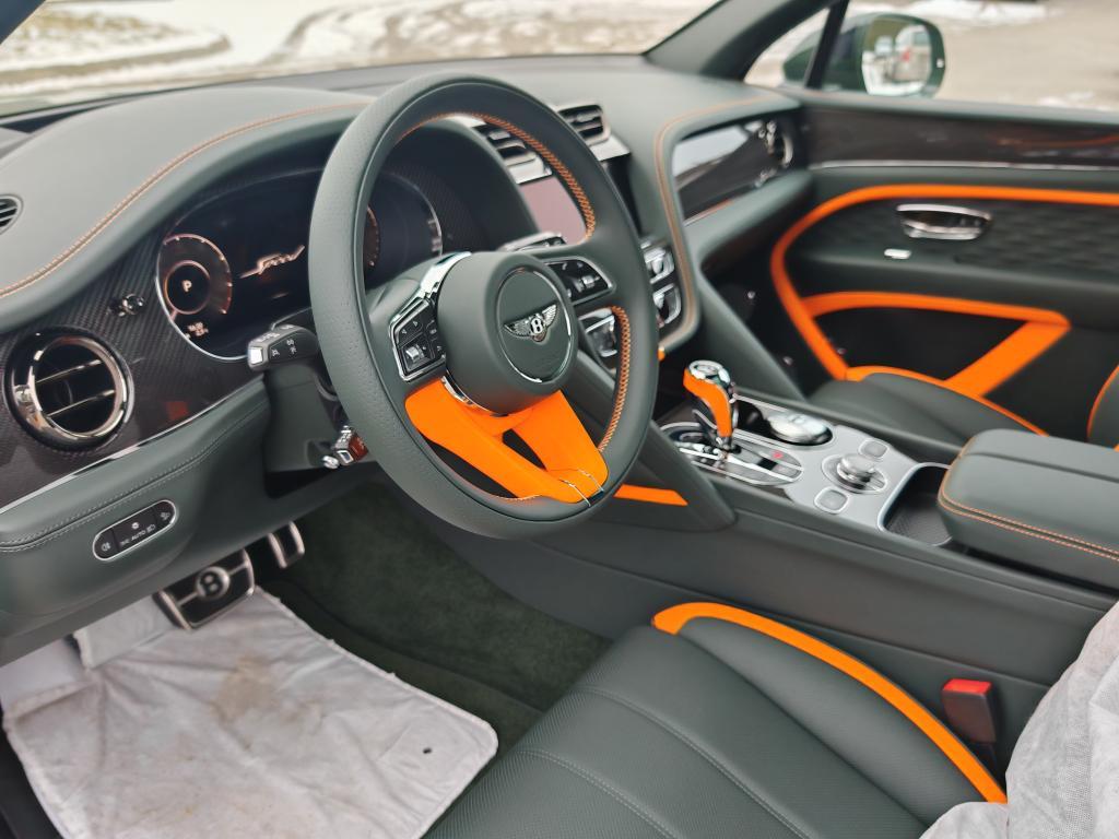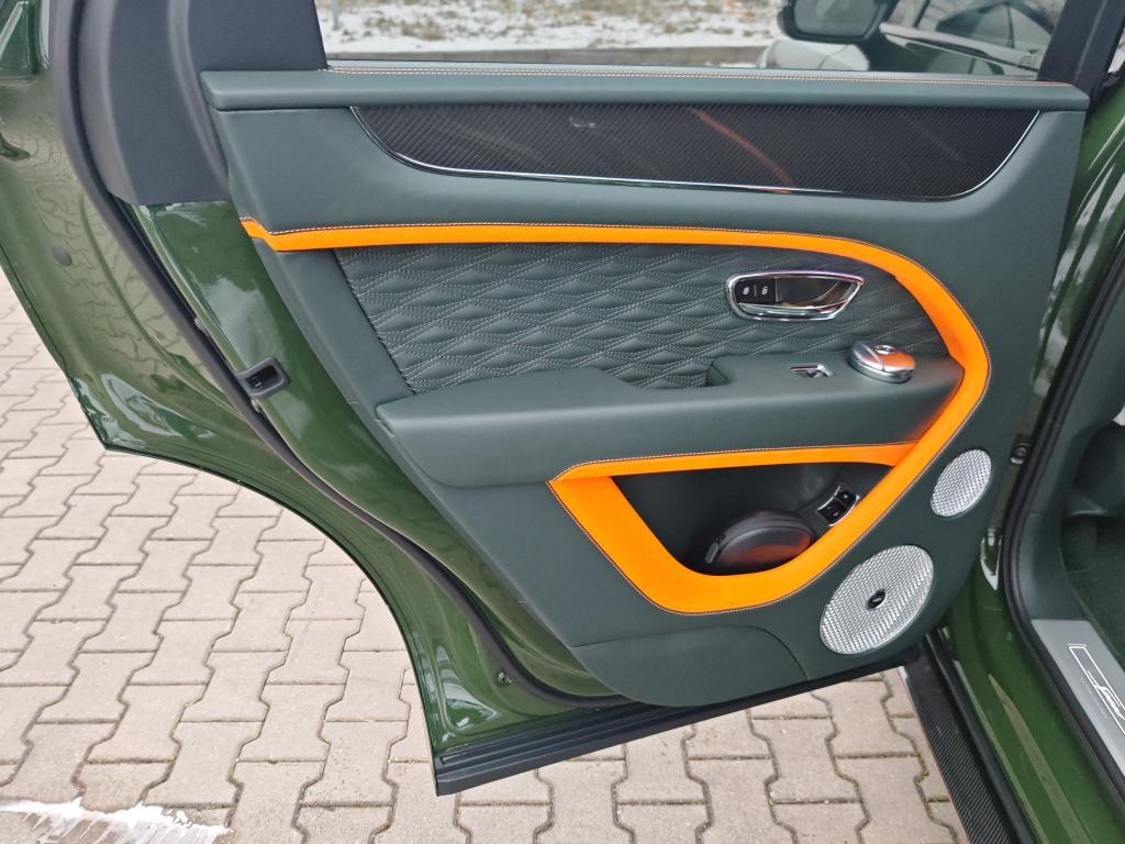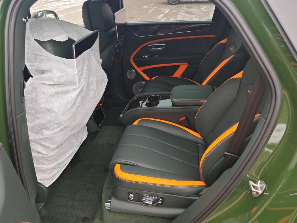 Contrast Stitching in Mandarin • Mulliner Range in British Racing Green 4 (Solid) • Animated Welcome Lamps by Mulliner • Contrast Gear Lever and Steering Wheel Spokes – by Mulliner • Touring Specification • “Jewel” fuel filler cap • Four Seater Comfort Specification with Rear Centre Console • Bentayga Blackline Specification • Black Roof and Roofrails • Heated, Acoustic, IR Front Screen • Rear Acoustic Privacy Glass • Heated, Single-Tone, 3-spoke, Indented Hide Trimmed Steering Wheel • Luggage Management • Smoker’s Specification • Lambswool Rugs by Mulliner – Front and Rear (in Addition to Standard Overmats) • Picnic Tables • Battery Charger – European Adaptor • Bentley Rear Entertainment • Mood Lighting • Valet Key • Naim for Bentley • in Mandarin • Carbon Fibre Fascia, Centre Console and Door Waistrails • Mulliner Colour Specification • Dark Chrome Interior Specification • Leather Specification • Dynamic Specification with 23" Black Painted Wheels • Carbon Ceramic Brakes with Mandarin Painted Calipers • Mandarin Pinstripe to Body Kit