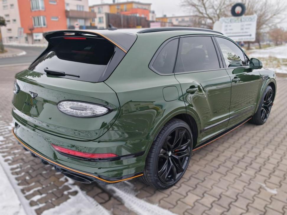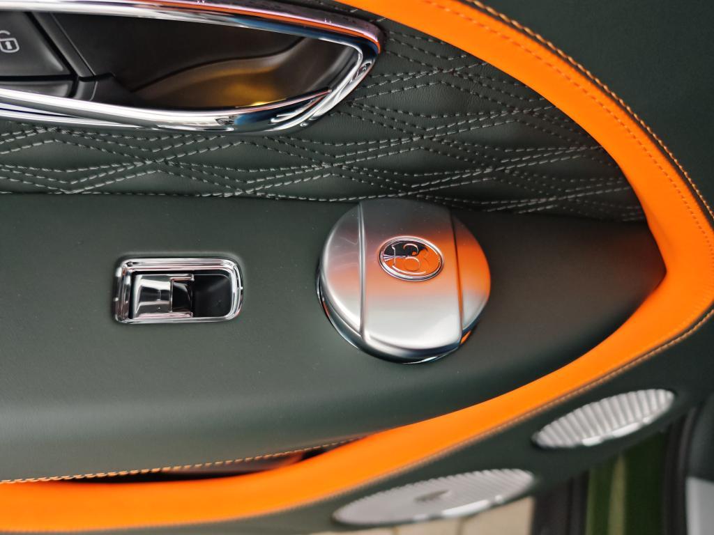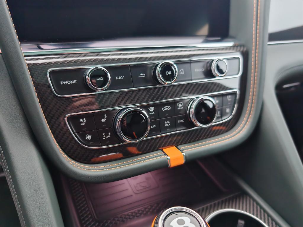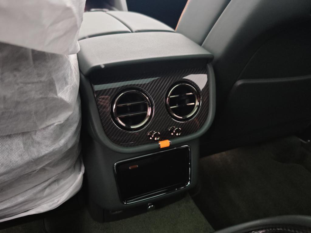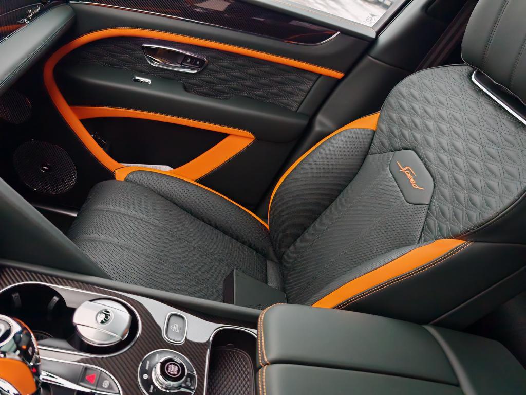 Contrast Stitching in Mandarin • Mulliner Range in British Racing Green 4 (Solid) • Animated Welcome Lamps by Mulliner • Contrast Gear Lever and Steering Wheel Spokes – by Mulliner • Touring Specification • “Jewel” fuel filler cap • Four Seater Comfort Specification with Rear Centre Console • Bentayga Blackline Specification • Black Roof and Roofrails • Heated, Acoustic, IR Front Screen • Rear Acoustic Privacy Glass • Heated, Single-Tone, 3-spoke, Indented Hide Trimmed Steering Wheel • Luggage Management • Smoker’s Specification • Lambswool Rugs by Mulliner – Front and Rear (in Addition to Standard Overmats) • Picnic Tables • Battery Charger – European Adaptor • Bentley Rear Entertainment • Mood Lighting • Valet Key • Naim for Bentley • in Mandarin • Carbon Fibre Fascia, Centre Console and Door Waistrails • Mulliner Colour Specification • Dark Chrome Interior Specification • Leather Specification • Dynamic Specification with 23" Black Painted Wheels • Carbon Ceramic Brakes with Mandarin Painted Calipers • Mandarin Pinstripe to Body Kit