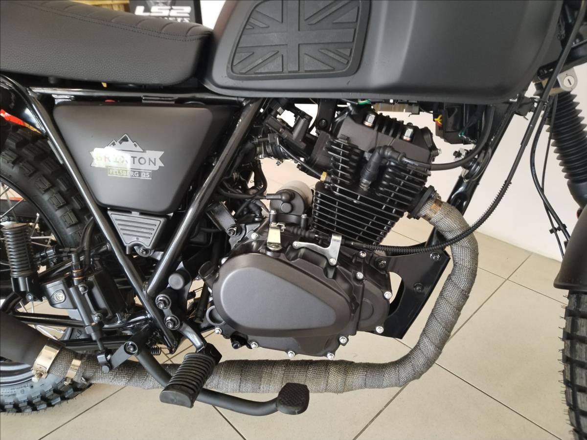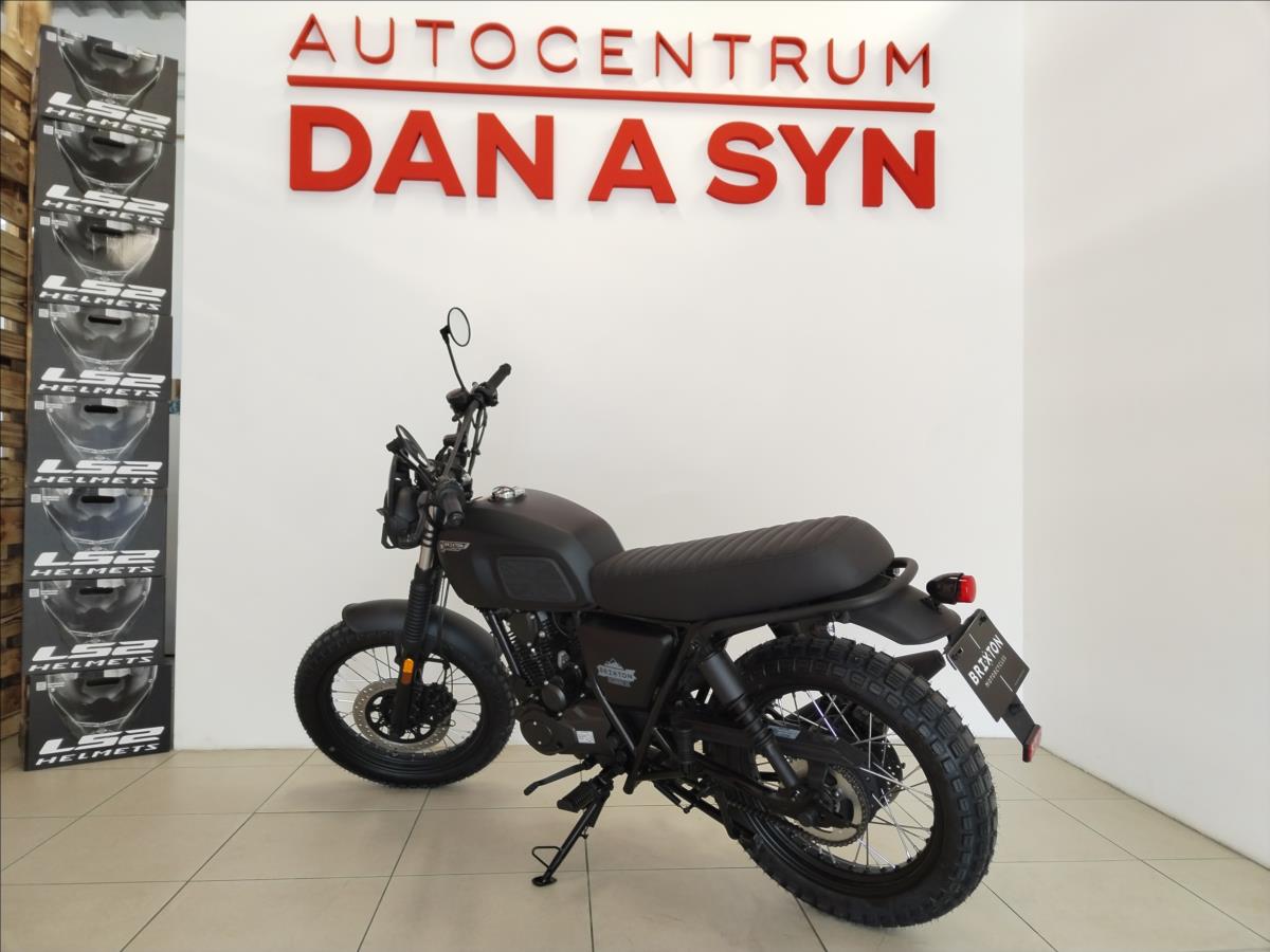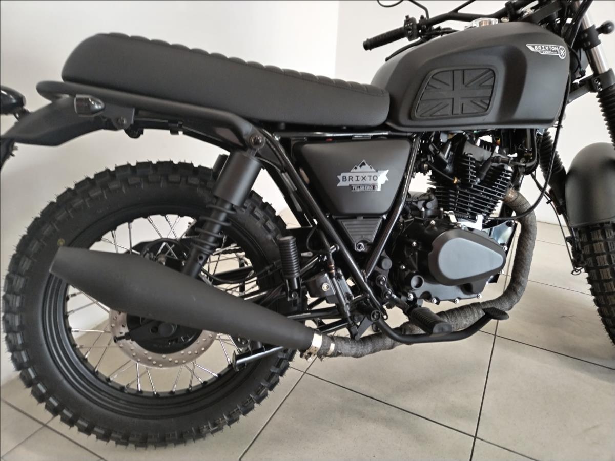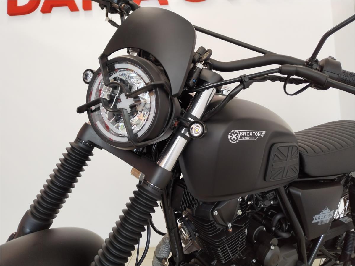 VYUŽIJTE NAŠE VÝHODNÉ FINANCOVÁNÍ. Motorka skladem! Dodání až k Vám domů do týdne. Jsme autorizovaný prodejce motocyklů Brixton. Nabízíme záruční i pozáruční servis Možnost prodeje na splátky i s 0% akontací. Typ motoruJednoválcový čtyřdobý motor, vzduchem chlazený Max. výkon8,2 kW @ 9000 min-1 Max. Točivý moment9,7 Nm při 6500 min-1 Objem motoru125 ccm Hmotnost134 kg Maximální přípustná hmotnost304 kg Délka2020 mm Šířka850 mm Výška1105 mm Výška sedadla~ 800 mm Kapacita palivové nádrže14 l