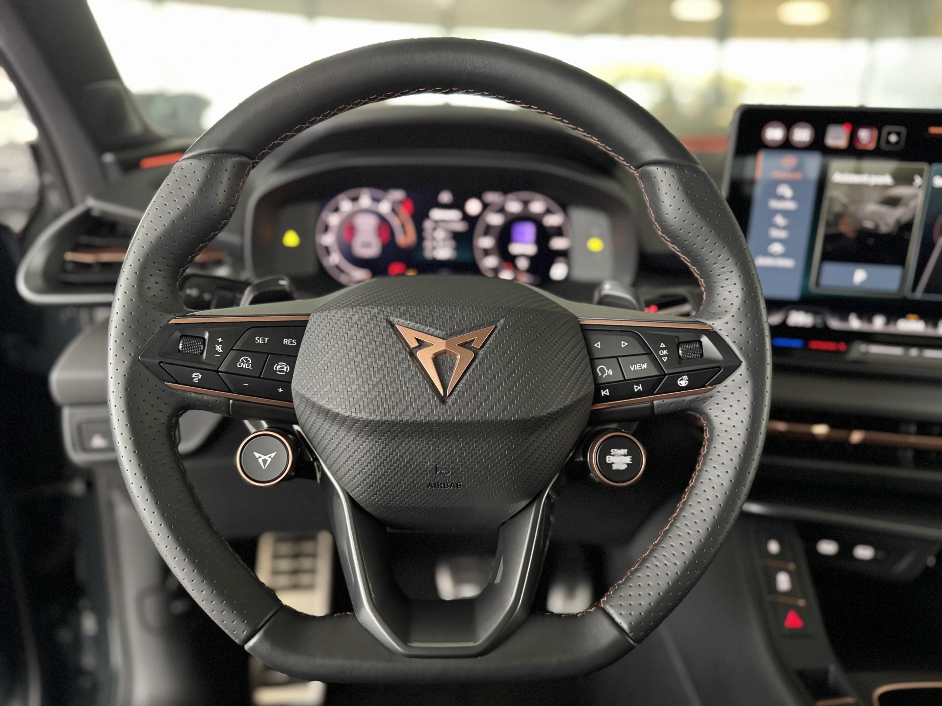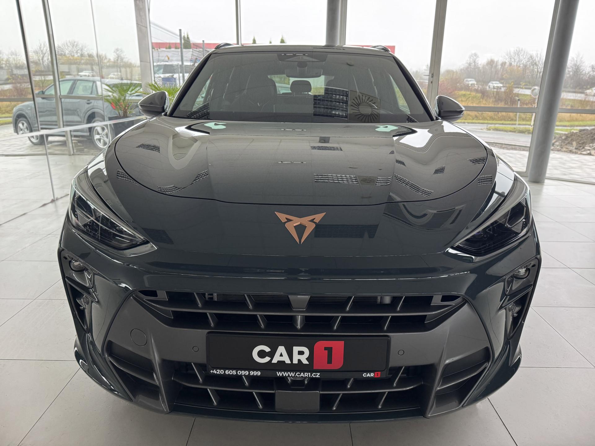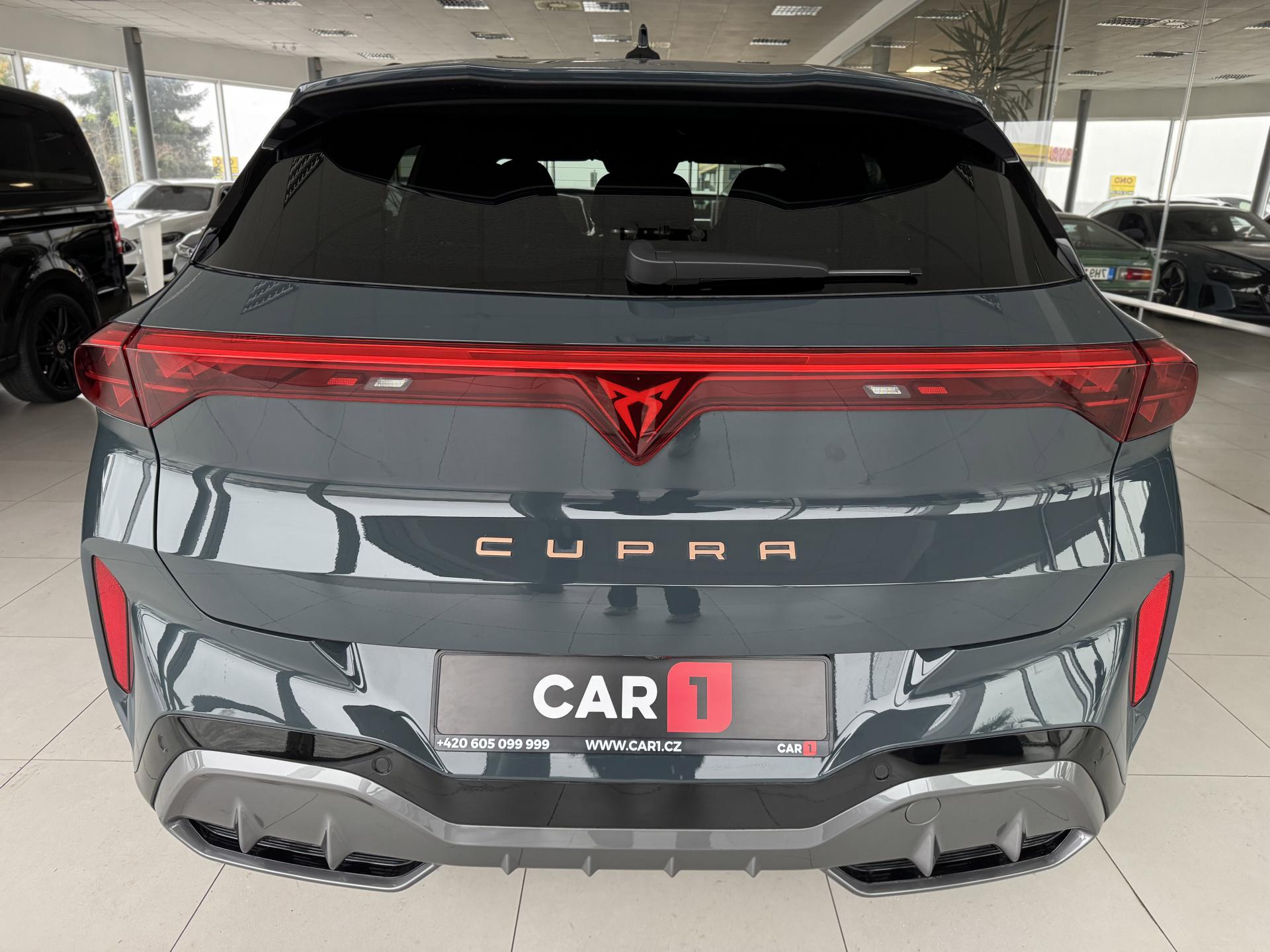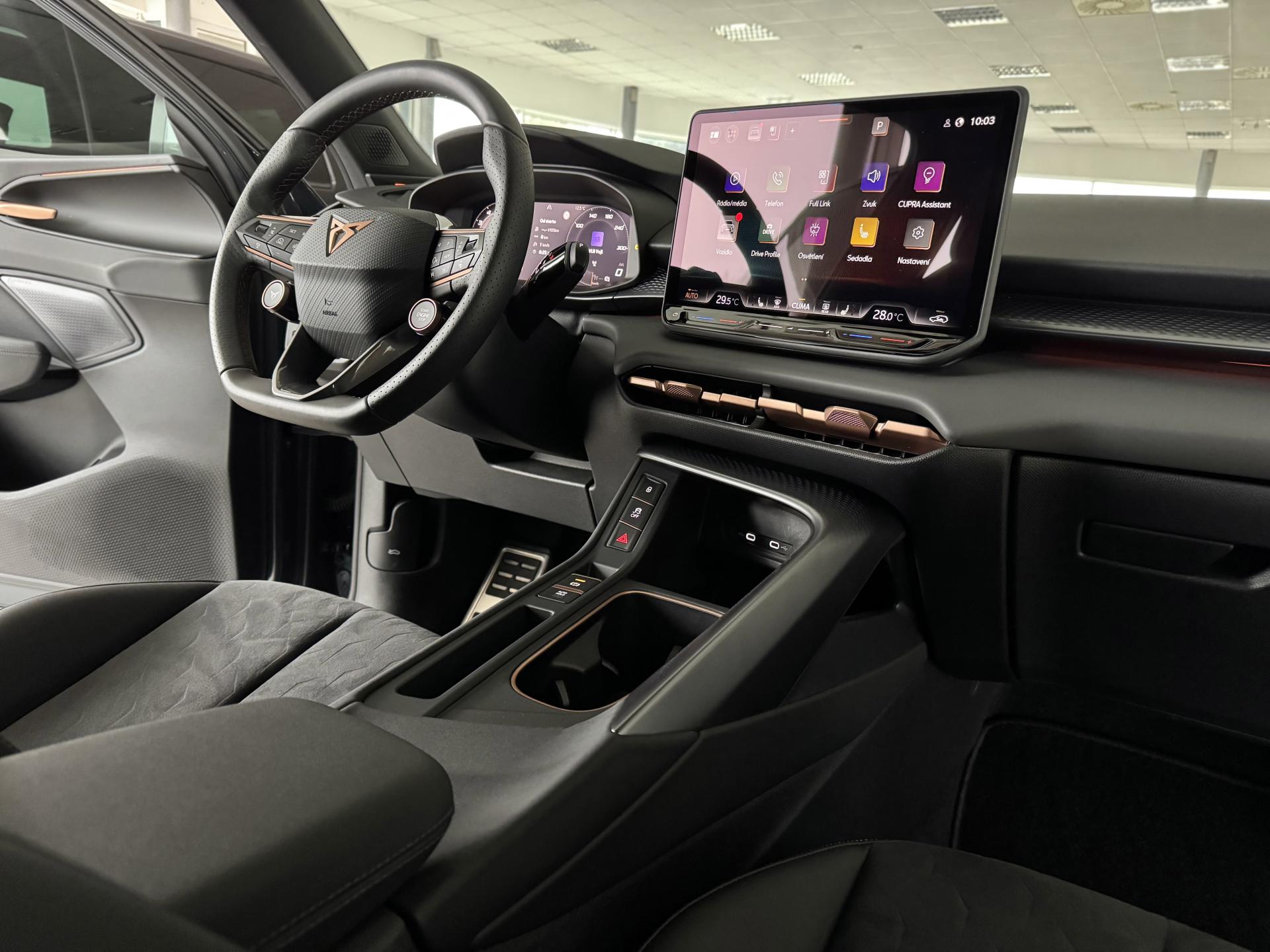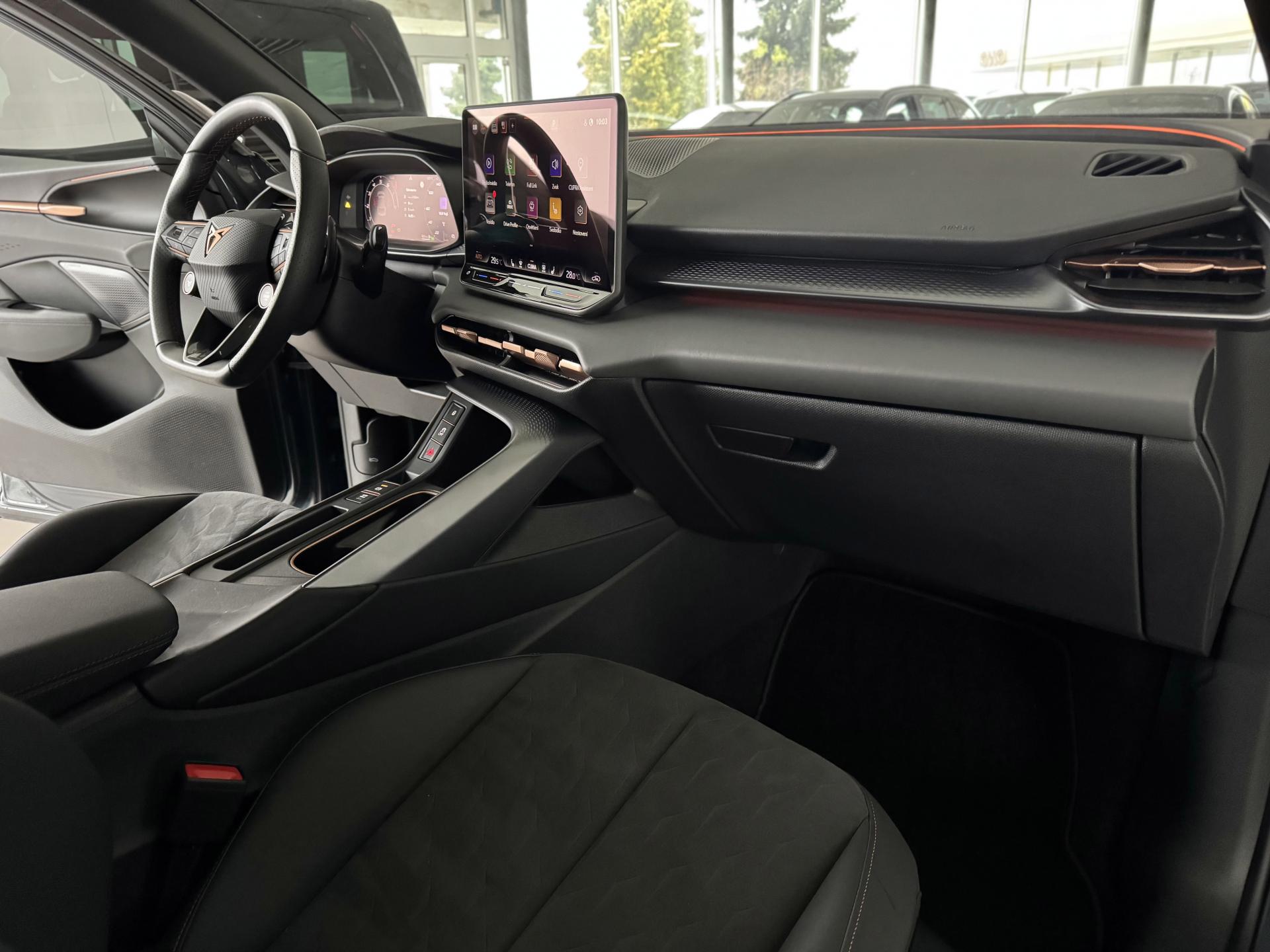 Stav nového vozu, plná tovární záruka do 04/2028. Pořizovací cena nového vozu 1.56mil. Kč. Nejsilnější motorizace o výkonu 195kW, pohon všech kol, Matrix LED přední světlomety, adaptivní tempomat, asistent jízdy v pruzích, parkovací kamera + senzory vzadu i vpředu, panoramatické střešní okno, navigační systém 12,9" s Cupra Connect včetně funkce Apple car play a Android auto, digitální přístrojový štít plus, bezklíčové odemykání a startování, 3-zónová aut. klimatizace, sportovní vyhřívaná el. stavitelná sedadla v provedení kůže/alcantara, paměťová funkce sedadla řidiče, sportovní vyhřívaný multifunkční volant s řazením pádly, ambientní osvětlení interiéru, prémiový audiosystém Sennheiser, zatmavení zadních oken, el. víko zavazadelníku, 19" orig. kola z lehkých slitin. Více na tel. +420 605 099 999.