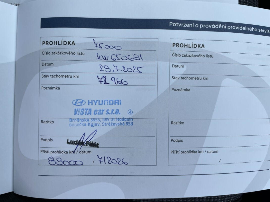 Platná plná tovární záruka Hyundai do 28.08.2027! Pravidelný autorizovaný servis. Poslední proveden 28.7.2025 při 73.000km. Vůz po prvním majiteli, zakoupený nový v České republice. Výbava Comfort Family: připojení Apple Car Play a Android Auto, LED denní svícení + automatické přepínání dálkových světel, tempomat, parkovací senzory včetně kamery, bluetooth a handsfree...Možnost odpočtu DPH z ceny vozu.
