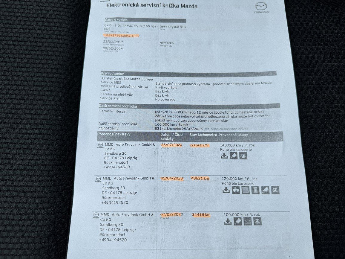 Model NAKAMA - 121 KW - 165 PS - do provozu 23.3.2017 - 81 427 km - full LED světlomety - automatická klimatizace - repro Bose - hlídání mrtvého úhlu - tempomat - bluetooth - parkovací kamera - keyless-go - orig. odnímatelné tažné zařízení - orig. AL. kola 19, ZÁNOVNÍ LETNÍ PNEU, možnost dokoupení kompletní sady orig. AL. zimních kol, elektronická servisní knížka, pravidelný servis MAZDA, poslední záznam 7/2024 při 63 141 km, po výměně náplní 2/2026 při 81 407 km. ZÁNOVNÍ PŘEDNÍ + ZADNÍ BRZDY. PERFEKTNÍ STAV !!! V případě zájmu naleznete kompletní informace včetně fotodokumentace přímo na našich stránkách AUTO-RE