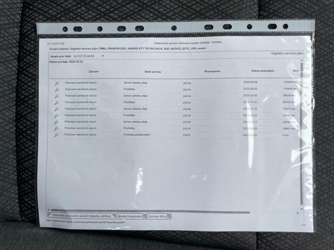 Bohatě dovybavený KAROQ po jediném majiteli s jasným původem Česká republika. Doložený pravidelný autorizovaný servis ŠKODA! Poslední servisní prohlídka provedena 8.9.2025 při 125.484km! Výbava STYLE+ mnoho navíc: nezávislé topení Webasto s dálkovým ovládáním, FULL LED adaptivní světlomety s funkcí automatického přepínání dálkových světel, originál el. výklopné tažné zařízení, virtual Cockpit, satelitní navigace, Apple Car Play a Android Auto, bezklíčový přístup i start, vyhřívané čelní sklo, vyhřívaná sedadla vpředu i vzadu a volant, adaptivní tempomat, přední i zadní parkovací senzory + kamera, el. víko kufru, sunset.. K vozu sada pěkných zimních pneumatik. Možnost odpočtu DPH z ceny vozu.