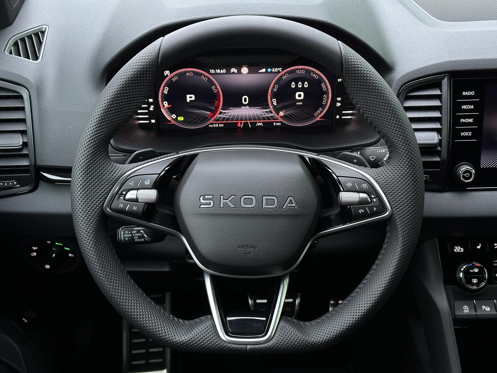 167/11018 Škoda Karoq Sportline 2.0TSi DSG 4x4 140kW/190PS, 7st. Automatická převodovka DSG, Tovární záruka Škoda Auto 5let/100.000km, Výbava vozu: Paket Drive PLUS - (Adaptivní podvozek DCC, Progresivní řízení, Hliníkové kryty pedálů, Volba jízních režimů + Off Road funkce), Tažné zařízení sklopné - el. odjistitelné, Panoramatické střešní okno, Kola z lehkých slitin ALU Škoda SAGITARIUS 8Jx19 Antracitová/Leštěná, Zásuvka 230V a nabíjecí port USB-C pro cestující vzadu, Paket Asistovaná jízda 2.0 - (Prediktivní tempomat - ACC, Rozpoznávání dopravních značek, Adaptivní asistent pro udržování v jízdním pruhu - Lane Assist+, Asistent sledování mrtvého úhlu - Side Assist, Automatické parkování), Asistent upozornění na únavu řidiče, Front Assist - Asistent upozornění na hrozící kolizi s vozidly, chodci a cyklisty, Start/Stop systém, Nouzový asistent, Asistent rozjezdu do kopce, Smartlink s bezdrátovým připojením - zrcadlení aplikací telefonu na Infotainment vozu, Digitální příjem rádia - DAB, Dvouzónová automatická klimatizace - Climatronic, Elektricky sklopná nastavitelná vnější zpětná zrcátka - vyhřívaná, ESP, 8x Airbag, Hlasové ovládání, Digitální asistentka Laura, Přední loketní opěrka s Jumbo Boxem, Senzor kontroly tlaku v pneumatikách, Systém nouzového volání SOS - eCall+, Přední sportovní sedadla, Výškově nastavitelná přední sedadla s bederní opěrkou, Vyhřívaná přední a zadní sedadla, Potah sedadel - látka, Integrované přední opěrky hlavy, El. otvírání předních a zadních oken, Sunset, Senzor světla a deště, KESSY - bezklíčové zamykání a startování, Matrix-LED přední světlomety s neoslňujícími dálkovými světly, Top-LED zadní světla s animovanými ukazateli směru jízdy, Ostřikovače předních světlometů, Ambientní LED osvětlení interiéru, Vyhřívané čelní sklo, Vyhřívané trysky ostřikovačů čelního skla, Virtualní Pedál - otevírání víka kufru pohybem nohy pod zavazadlovým prostorem, Virtualní Cockpit 10, Infotainment Amundsen 8 s Navigací, Panoramatický kamerový systém 360°, Parkovací senzory vpředu a vzadu - PDC, Vyhřívaný sportovní multifunkční kožený volant s pádly řazení pro DSG pod volantem, USB-C pro vnitřní zrcátko, USB-C vpředu, 12V zásuvka v zavazadlovém prostoru, Sound systém CANTON, Digitální ekvalizér, 10x reproduktor, Exteriér Sportline - (dekorativní prahy dveří, černě lakované doplňky karoserie, sportovní nárazníky), Střešní nosič, Ocelové rezervní kolo, Servisní kniha + dokumentace Škoda Auto, Možnost odpočtu DPH 21%, Termín odběru a předání vozidla od 24.01.2026.