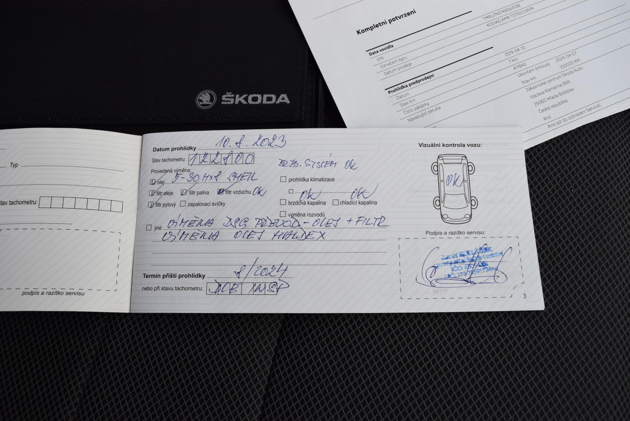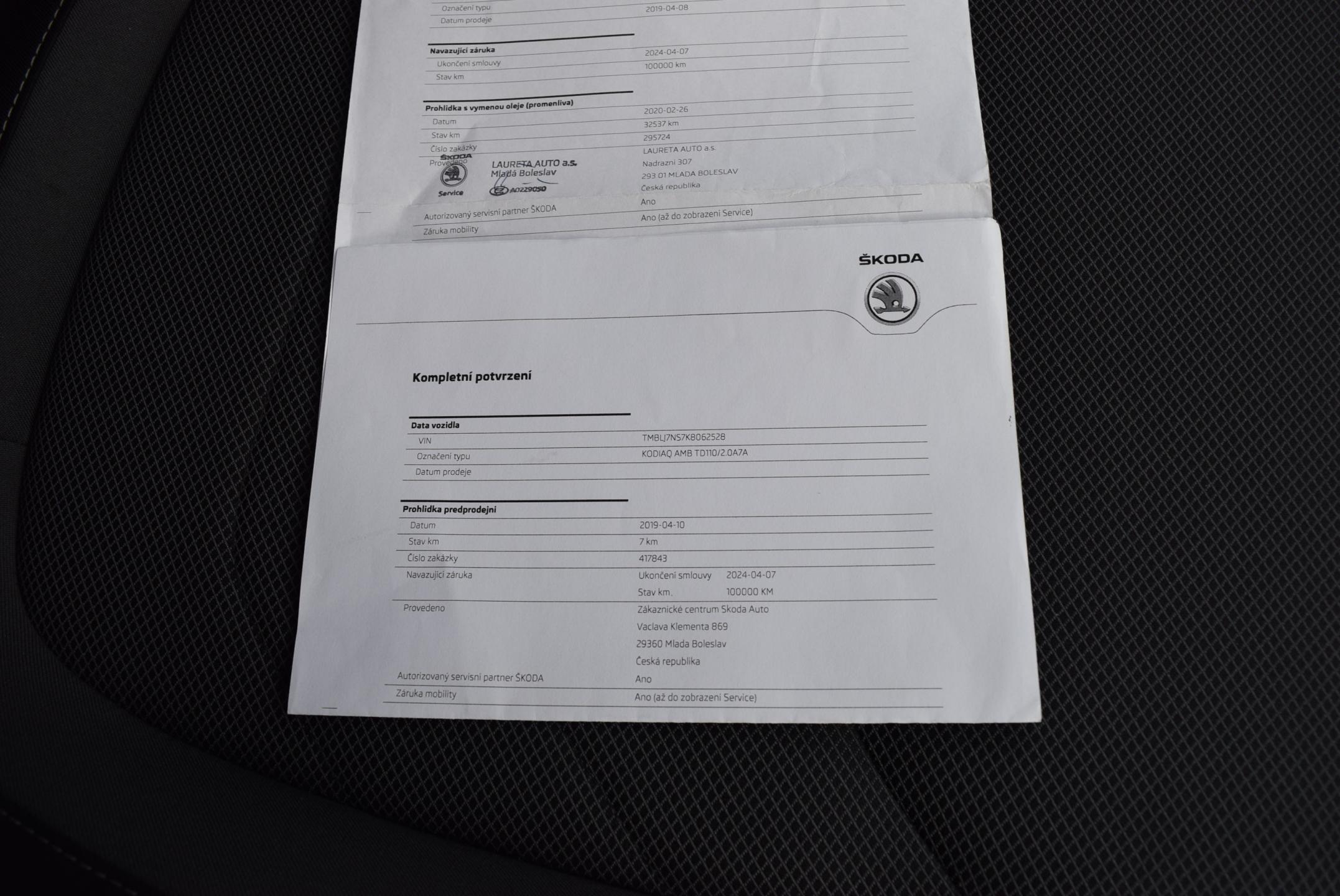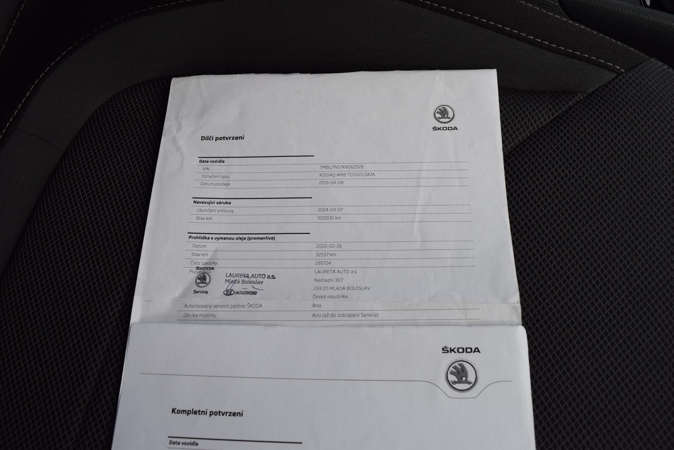 VIN: TMBLJ7NS7K8062528, Země původu ČR; po 1.majiteli, kupováno jako nové; DSG 7° + možnost řazení pádly pod volantem; POHON 4x4; VÝBAVA AMBITION - GARANCE UJETÝCH KM-doloženo kompletně vedenou ONLINE servisní knihou v autorizovaném servisu ŠKODA; HEZKÁ VÝBAVA: CLIMATRONIC - DVOUZÓNOVÁ digitální automatická klimatizace; 2x VYHŘÍVANÉ SEDAČKY přední; kožený tříramenný, MULTIFUNKČNÍ VOLANT; 4x el. stahovatelná okna; LED adaptivní světlomety s LED denním svícením; parkovací senzory vpředu i vzadu; el. stavitelná+el. sklopná+ VYHŘÍVANÁ zrcátka; SOUND MULTIMEDIA SYSTÉM orig. ŠKODA s barevným dotykovým displejem, rádiem, výstupy USB&SD Card, podporou APPLE Car play Android Auto, Smartlink; BLUETOOTH rozhraním vč. HANDSFREE; MAXIDOT-velký barevný palubní počítač; ALU kola orig. ŠKODA + zimní sada ALU k vozidlu; bezklíčkové startování tlačítkem; plnohodnotná rezerva; el. sklopné tažné zařízení; Technicky i motoricky v perfektním stavu; KAROSERIE bez škrábanců; Interiér NEKUŘÁK bez známek opotřebení; DOŽIVOTNÍ ZÁRUKA NA PRÁVNÍ PŮVOD A NAJETÉ KM, záruka 1ROK na motor + převodovku.