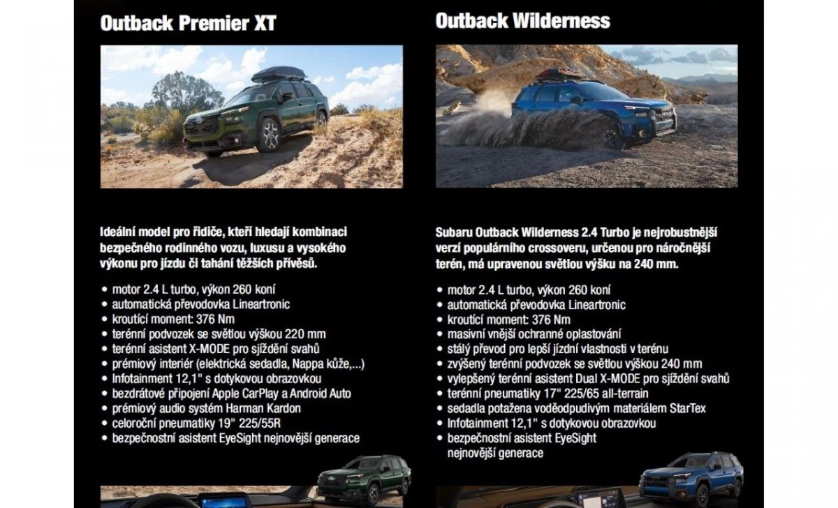 ABSOLUTNÍ NOVINKA, KTERÁ NA EVROPSKÝ TRH PŘICHÁZÍ POUZE SKRZE NÁS. NOVÝ OUTBACK S PŘEPLŇOVANÝM MOTOREM A VÝKONEM 260 KONÍ!!! XT PREMIER JE NEJVYŠŠÍ SPECIFIKACE, BOHATÁ NADSTANDARDNÍ VÝBAVA. MOŽNOST TAKÉ VE VÝBAVĚ WILDERNESS Bližší info na tel: 724339677. , Umístění: ALGON PLUS - AUTO a.s., Stará Ovčárna 2059 Sokolov 356 01, Tel: 720 975 549, E-mail: lucie.zimmermannova@algon.cz. Tato inzerce není návrh na uzavření kupní smlouvy dle zákona 89/2012 Sb.